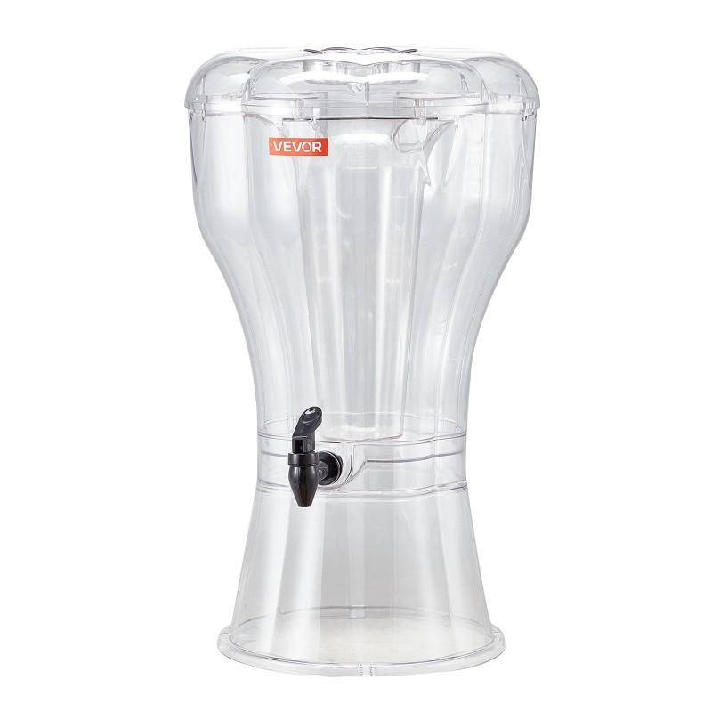 Läpinäkyvä juomadispenseri, jonka tilavuus on 13 L / 3.4 gallonaa, sopii hyvin ravintoloihin, hotelleihin, kahviloihin ja juhliin. Suuri säiliö vähentää täyttökertoja ja helpottaa erilaisten kylmien juomien, kuten mehun, jääteen ja veden tarjoilua.