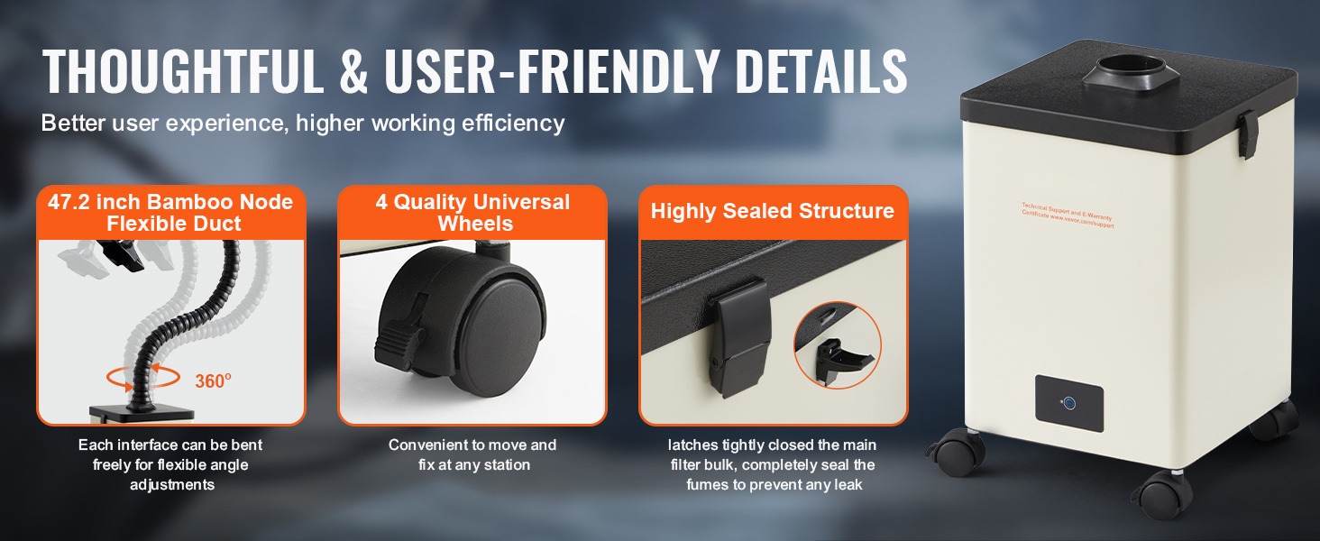 47.2-tuumainen joustava letku voidaan taivuttaa vapaasti juuri siihen kohtaan, missä savua syntyy. Neljä laadukasta kääntyvää pyörää (joista 2 jarrullisia) helpottavat laitteen siirtämistä ja lukitsemista paikalleen. Tiivis rakenne ja metallisalvat pitävät pääsuodatinlohkon tiukasti suljettuna, jolloin savut eivät vuoda ulos.