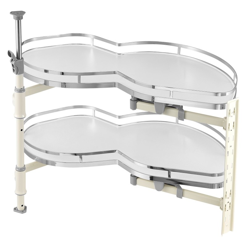 Tämä kääntyvä kulmakaapin ulosvedettävä hylly auttaa hyödyntämään tehokkaasti sokkelikulmakaapin sisätilan. Kaksitasoinen, korkeussäädettävä mekanismi tuo myös syvälle kulmaan sijoitetut astiat ja kattilat helposti ulottuville.