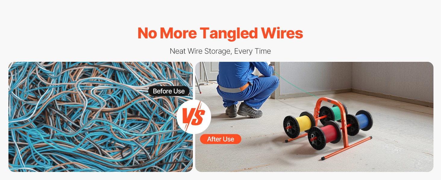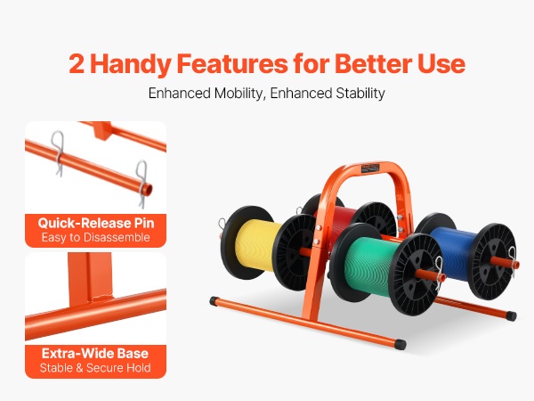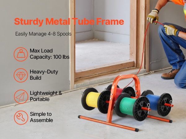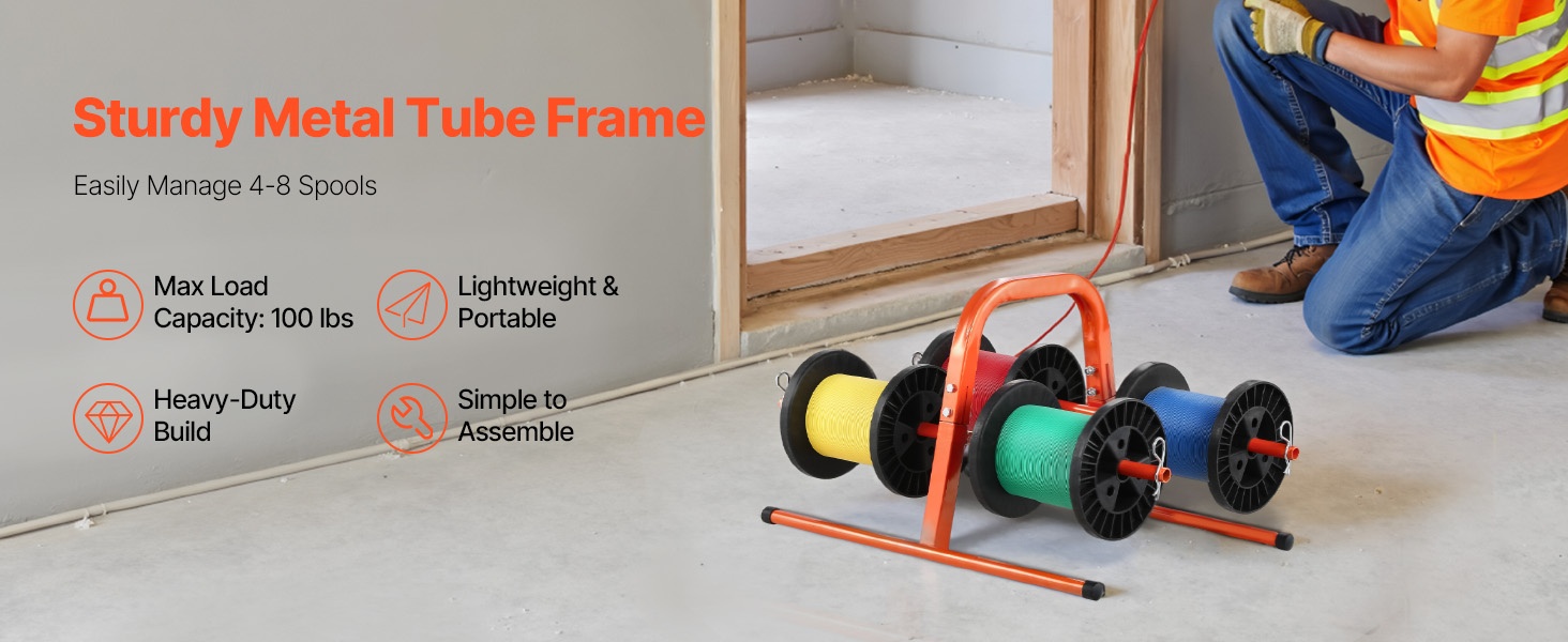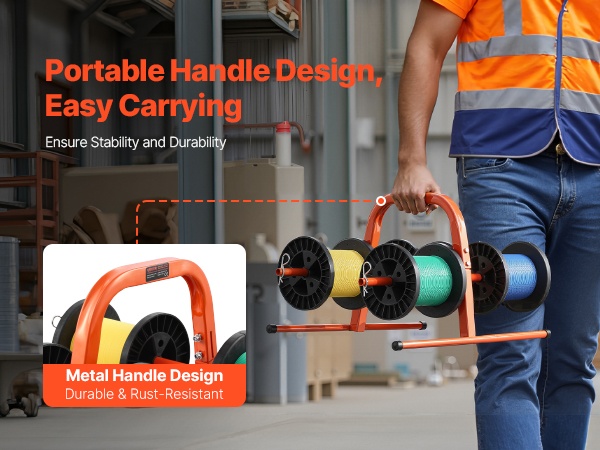 Kestävästä Q195‑teräsputkesta valmistettu käsiteline on suunniteltu pitkäaikaiseen käyttöön. Se tukee 4–8 kela-akselia, ja kelan suurin halkaisija on 9.45 tuumaa. Paino on 4.85 lbs / 2.2 kg, joten telinettä on helppo kantaa ja siirtää. Jauhemaalattu pinta suojaa ruostumiselta ja kulumiselta, mikä tekee telineestä sopivan monenlaiseen kaapelinhallintaan teollisuudessa ja muissa ympäristöissä.