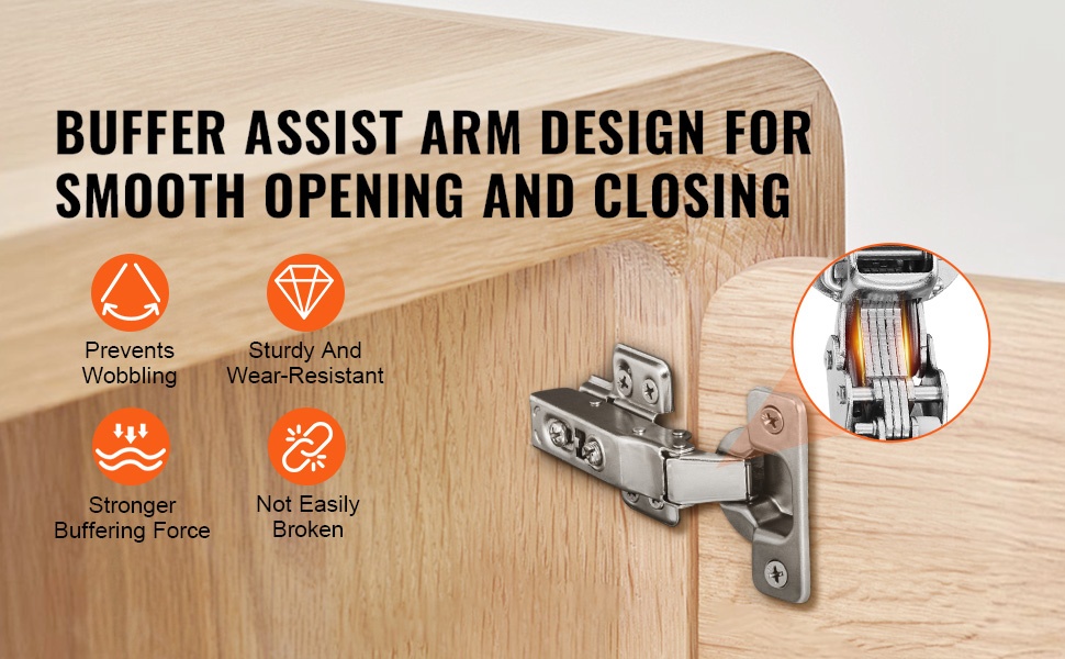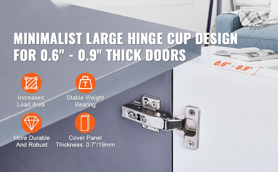 Pelkistetty, suurikokoinen saranakuppi kasvattaa kosketuspintaa ja parantaa kantavuuden vakautta. Saranat pysyvät tukevina myös 0.6–0.9 tuuman paksuisissa ovilevyissä, jolloin ovi kestää käytössä vääntymättä.