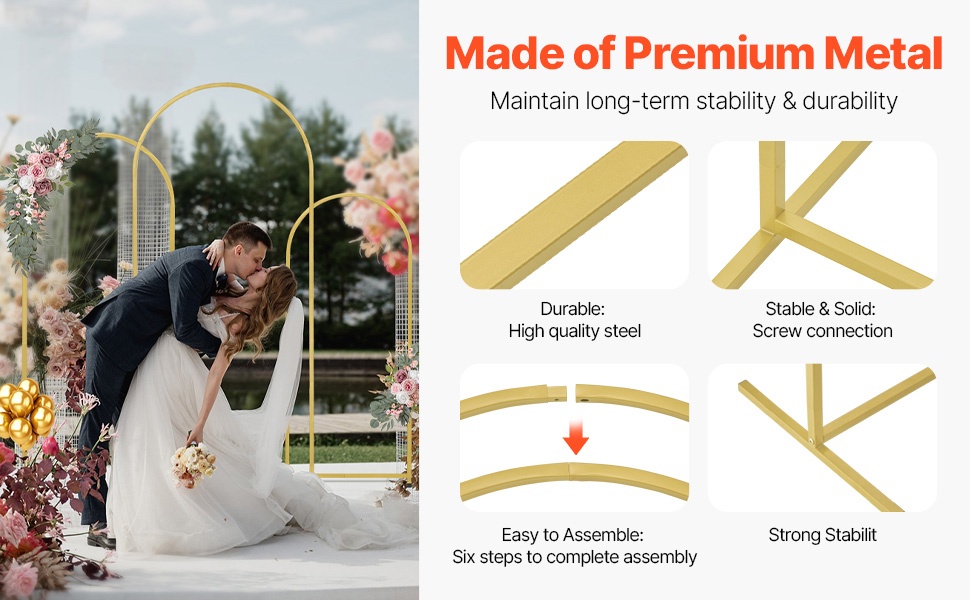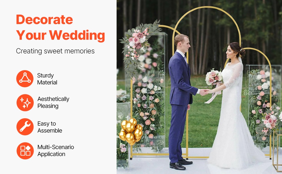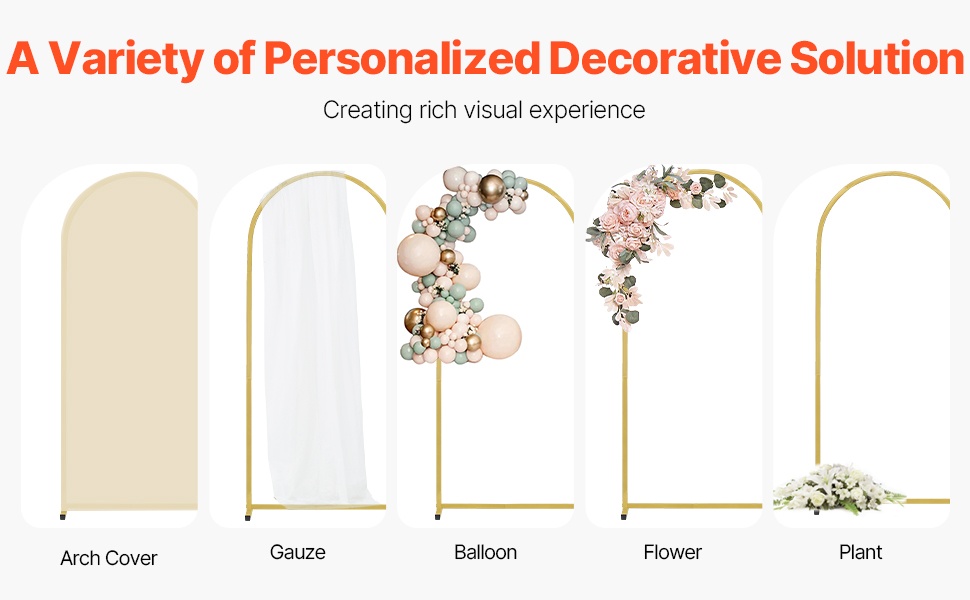 Kaksiosainen kullanvärinen kaari-taustateline luo juhlavan ja tunnelmallisen taustan erilaisiin tilaisuuksiin. Pakkauksessa on kaksi eri kokoista kaarta, jotka sopivat hyvin esimerkiksi häihin, syntymäpäiville, juhliin ja sesonkikoristeluun.