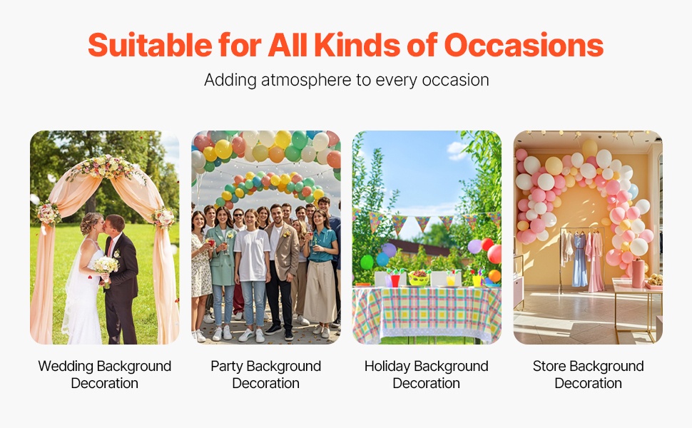 - Kaksi kaarta: 7.2 x 4 ft ja 6 x 2.6 ft monipuolisiin somistuksiin