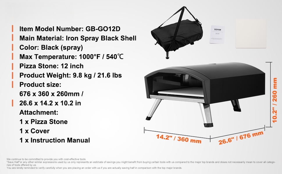 Taittuvat jalat ja suhteellisen kevyt rakenne helpottavat siirtämistä ja kuljettamista ulkotiloissa. Mukana tuleva vedenpitävä suojus auttaa suojaamaan uunia, kun se ei ole käytössä.Tekniset tiedot: