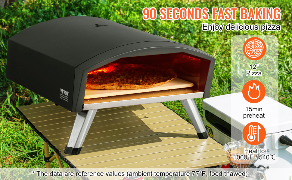 Uuni esilämmitetään noin 15 minuutissa, jonka jälkeen 12-tuumainen pizza kypsyy noin 90 sekunnissa. Korkea, jopa 540℃ lämpötila antaa rapean pohjan ja kauniin paistopinnan.Kaasukäyttöinen ja helppo käyttää: