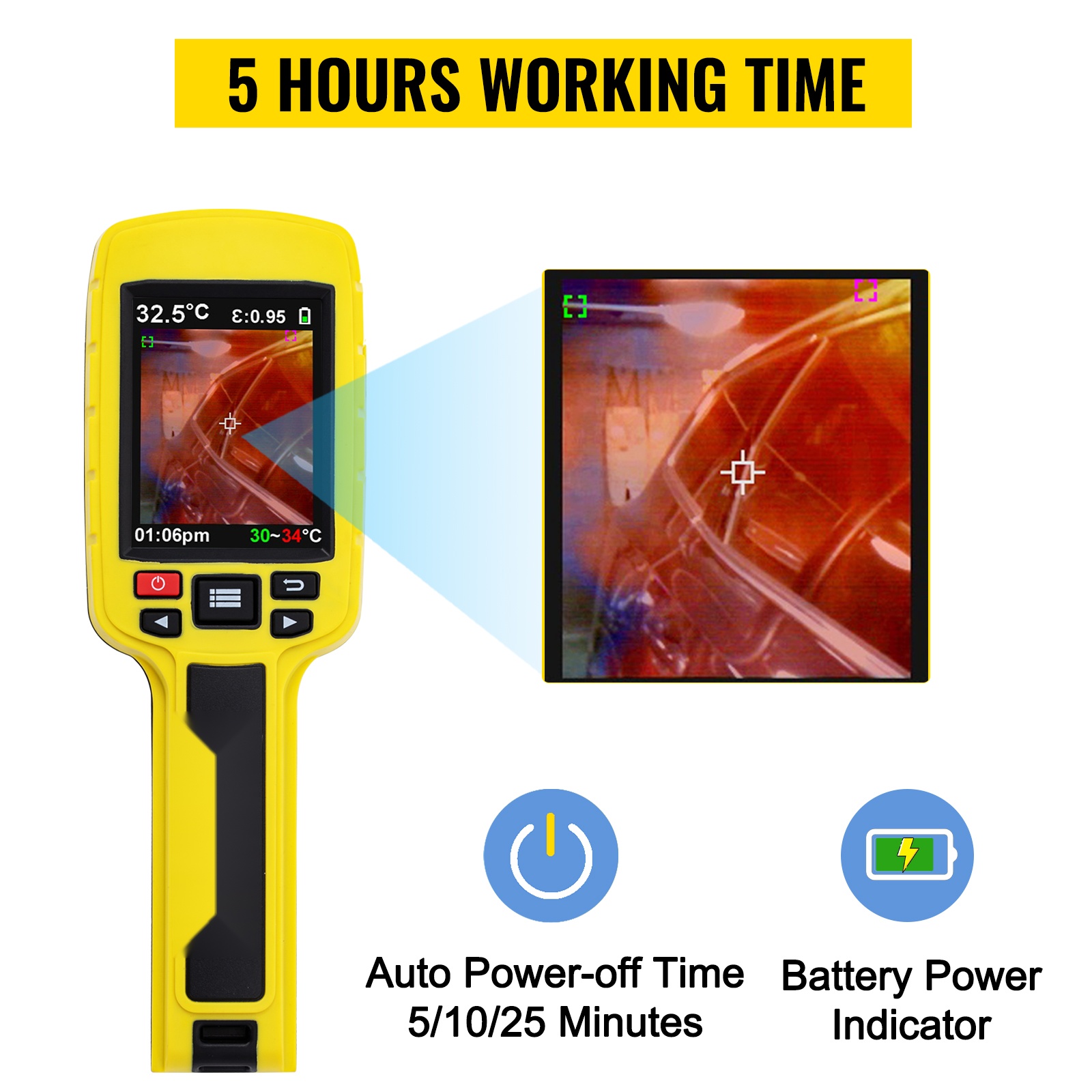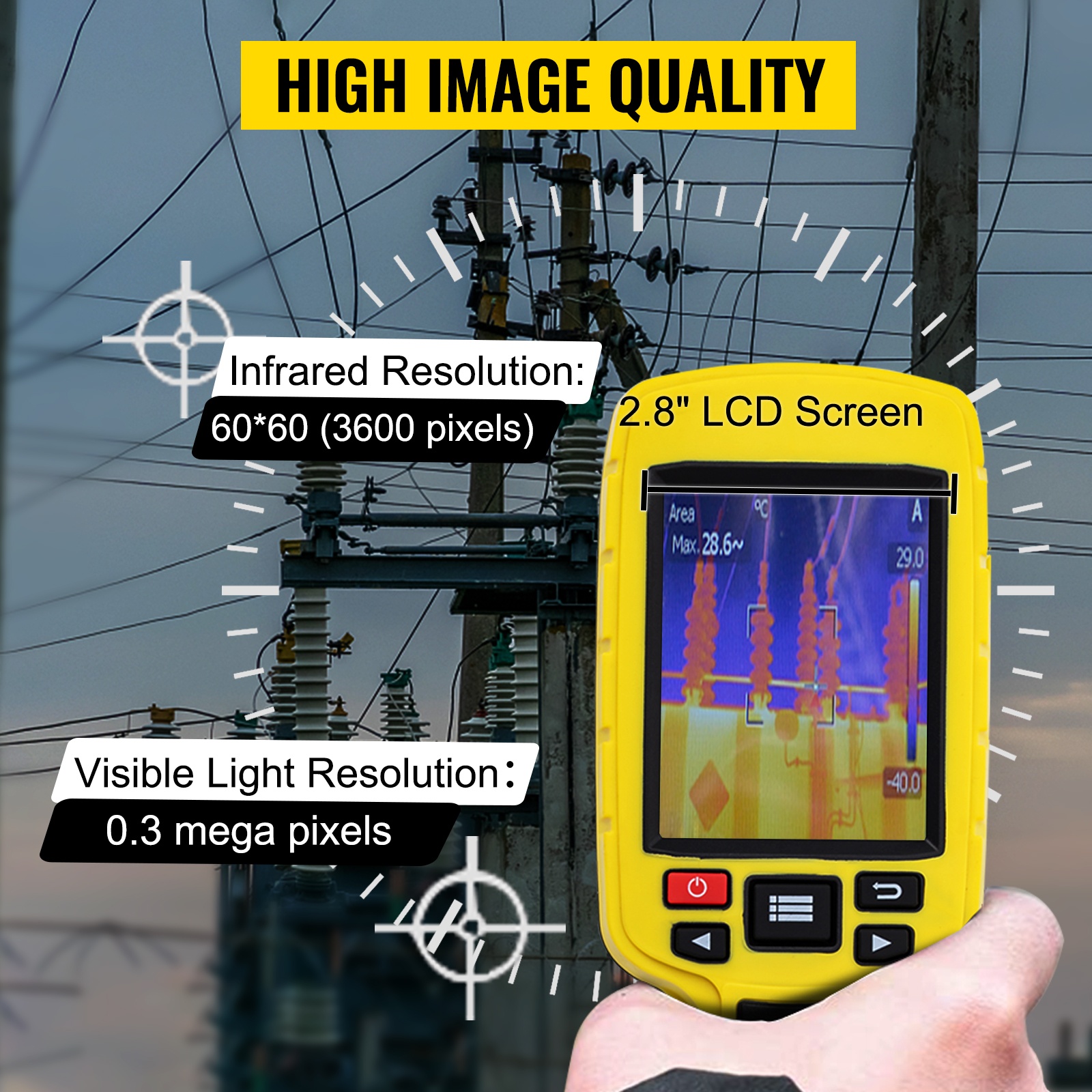 Lämpökamerassa on 2.8-tuumainen näyttö ja 60x60 (3600 pikseliä) infrapunaresoluutio. Näet koko lämpökuvan selkeästi, mikä helpottaa erilaisten lämpövuotojen, ylikuumenemisten ja muiden ongelmien tunnistamista.