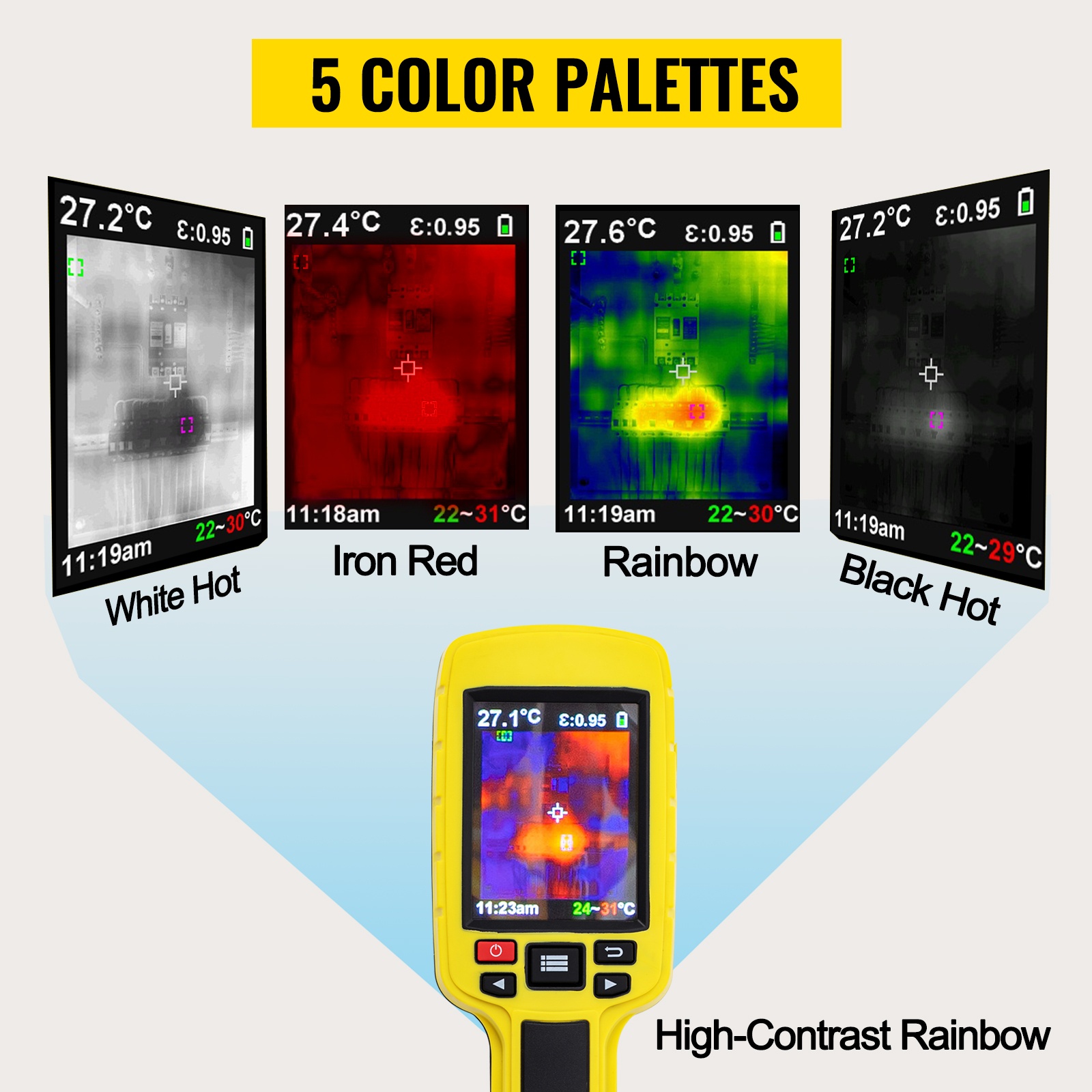 Käytettävissä on viisi väripalettia: rautapunainen, sateenkaari, korkean kontrastin sateenkaari, valkoinen-kuuma ja musta-kuuma. Voit valita kuhunkin tilanteeseen sopivimman esitystavan, jotta lämpötilaerot erottuvat mahdollisimman hyvin.