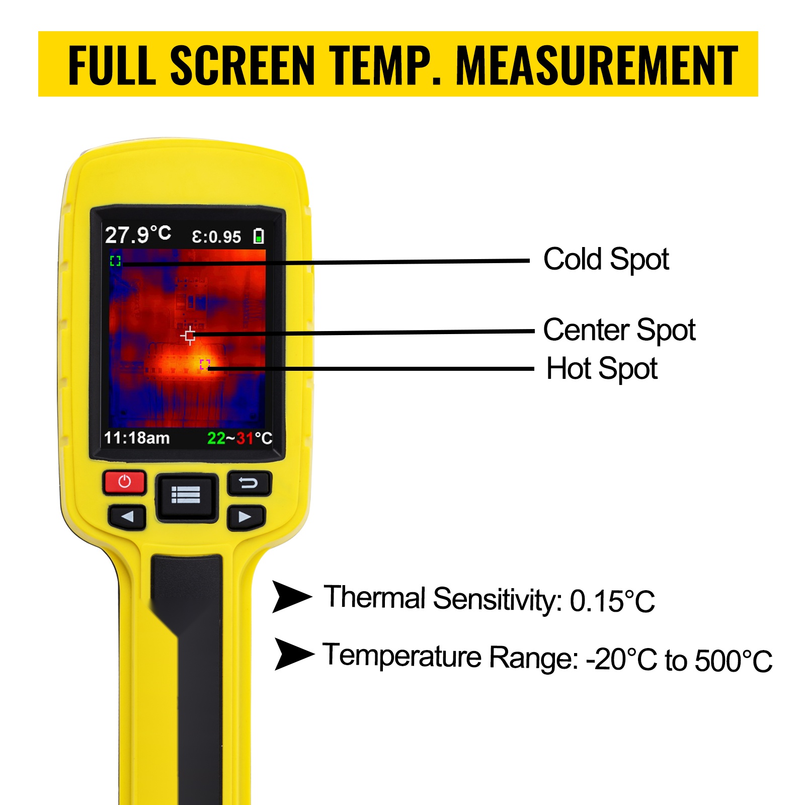 Herkkä ja tarkka lämpöanturi auttaa havaitsemaan poikkeamat nopeasti. Lämpötilan mittausalue on -20°C – 500°C / -4 ℉ – 932 ℉. Lämpöherkkyys 0.15℃ mahdollistaa korkeimman ja matalimman lämpötilan tarkan tunnistamisen koko näytöltä.