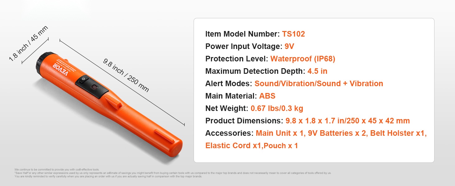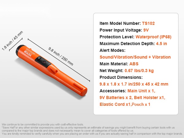 - Maksimi tunnistussyvyys jopa 50mm / 1.96 tuumaa pienille metalliesineille