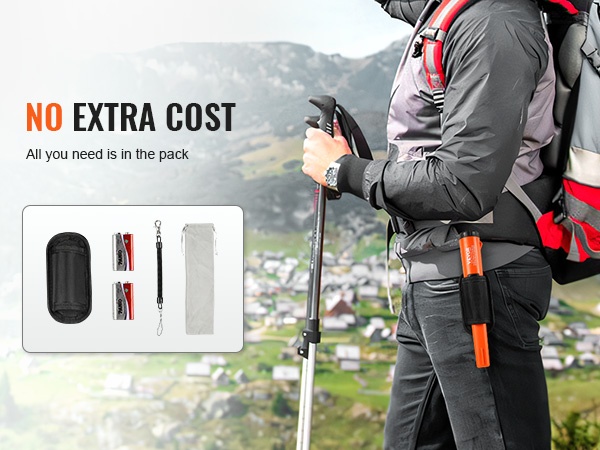 Paketissa on mukana keskeiset tarvikkeet: kaksi paristoa, vyölle kiinnitettävä kotelo, joustava kierrejohto sekä vedenpitävä pussi. Näiden avulla laite kulkee helposti mukana ja on nopeasti käyttövalmis.