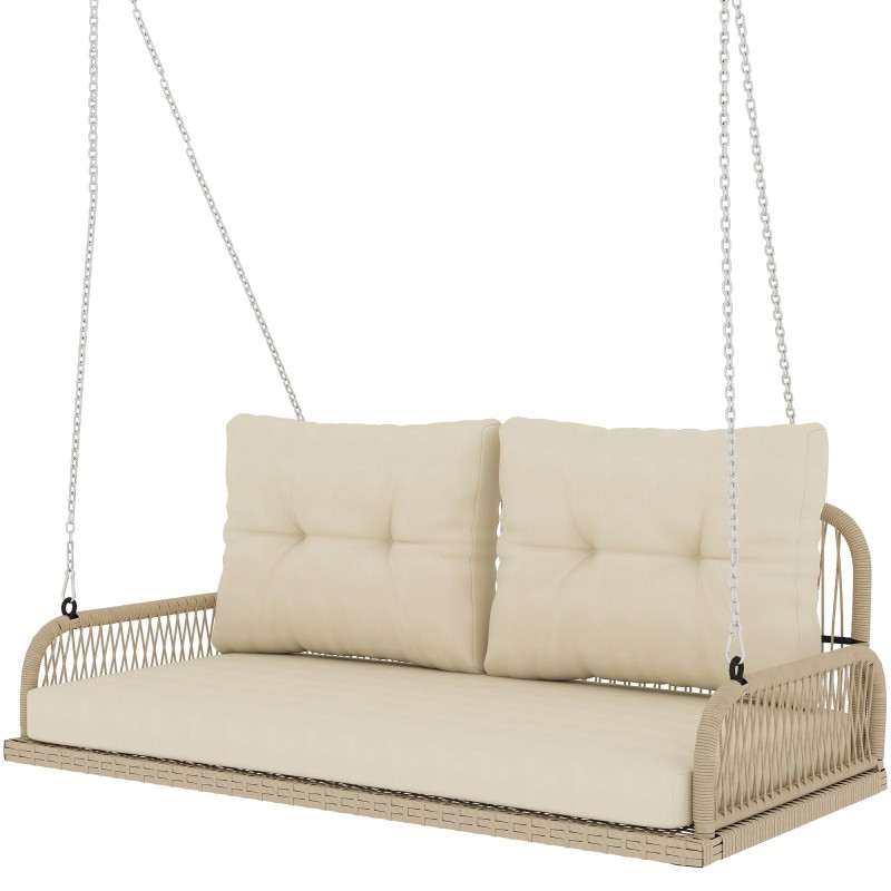 Riippukeinussa on luonnonvärinen runko ja beiget tyynyt, ja tuotteen paino on noin 13,40 kg.