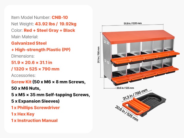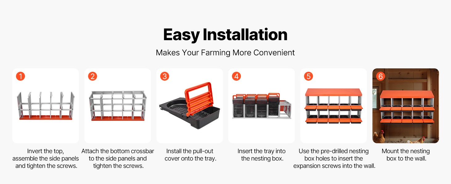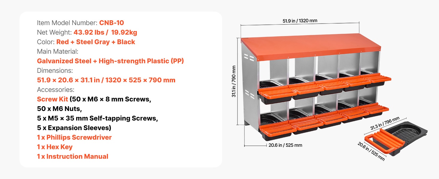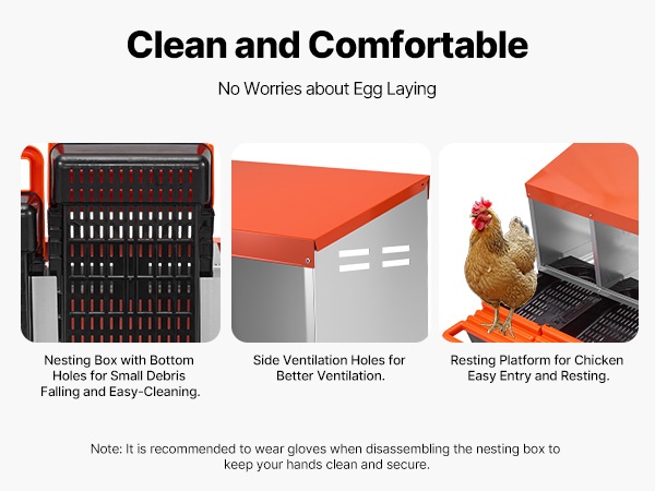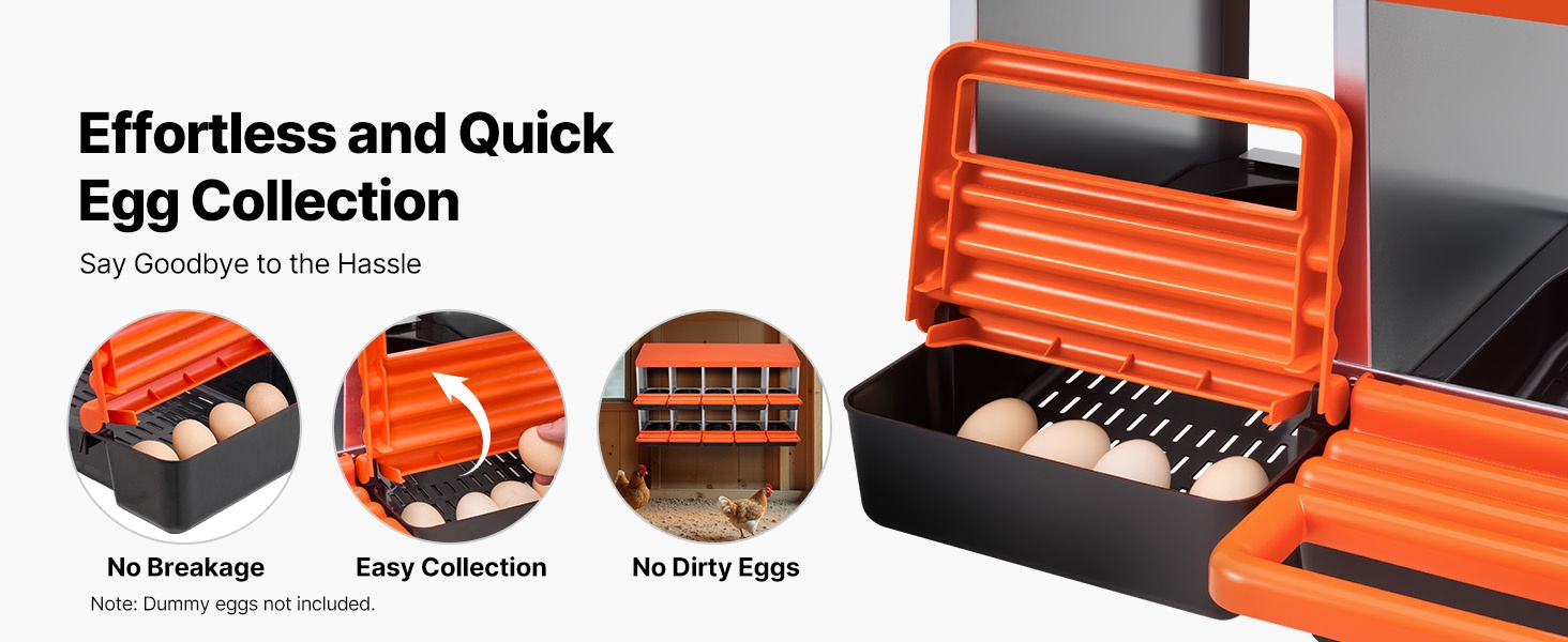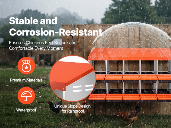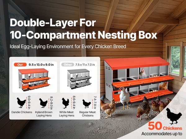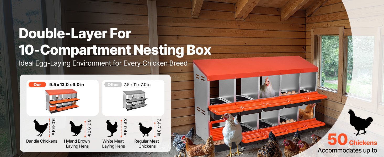 Kaksikerroksinen, 10-osastoinen munintapesä metallirungolla tarjoaa tilavan ja suojaisan paikan muninnalle kanoille, ankoille ja muulle siipikarjalle. Kallistuva rakenne kerää munat erilliseen alueeseen, mikä helpottaa keruuta ja vähentää rikkomista.
