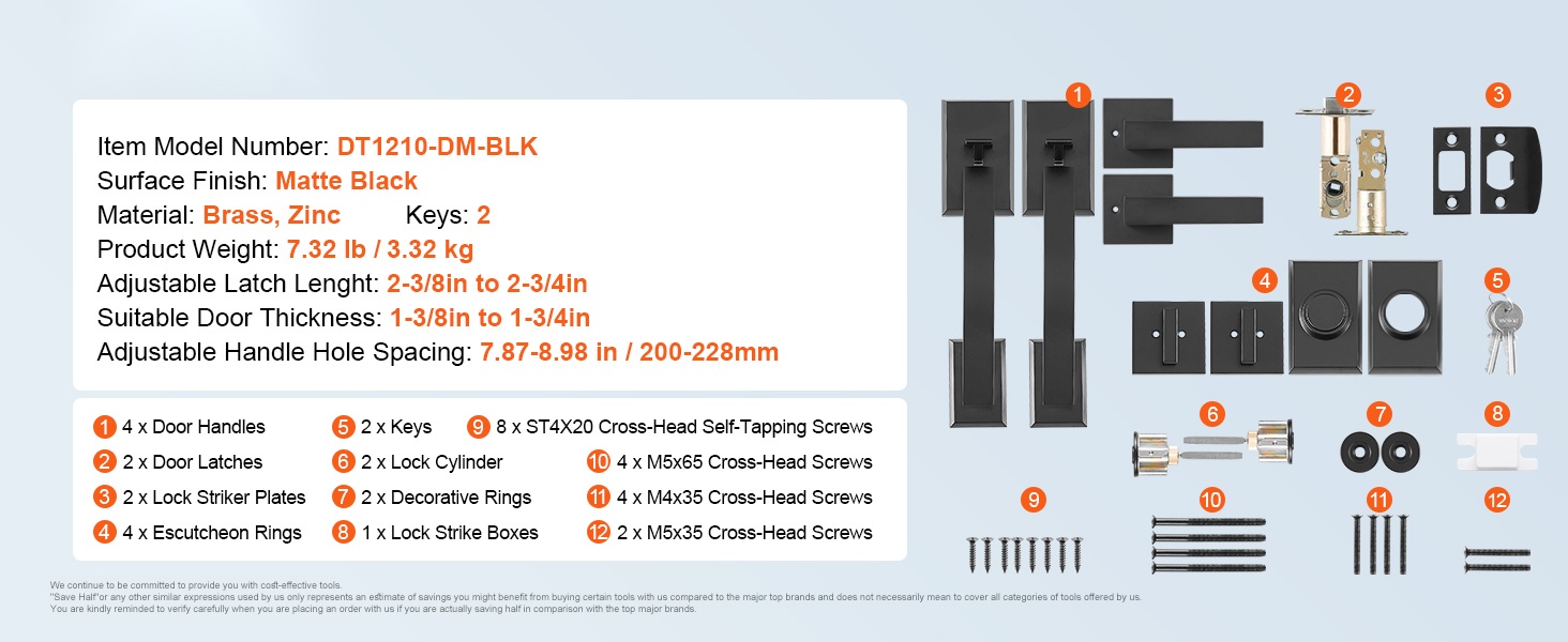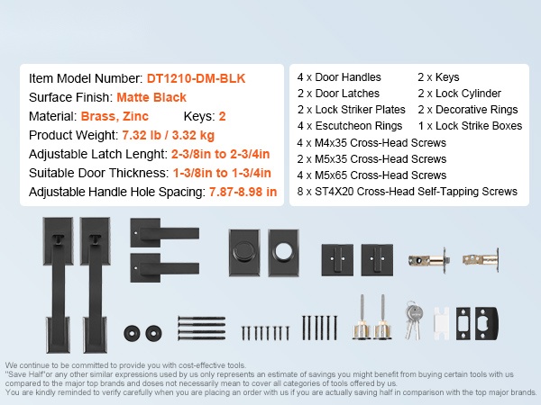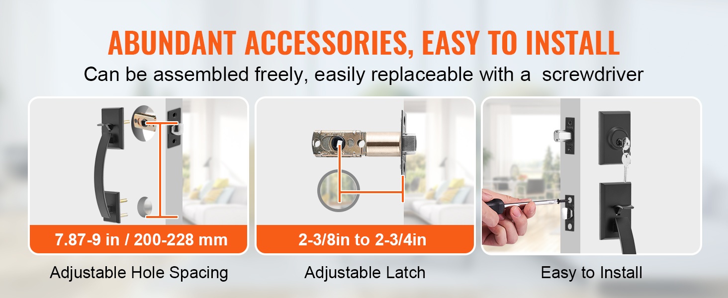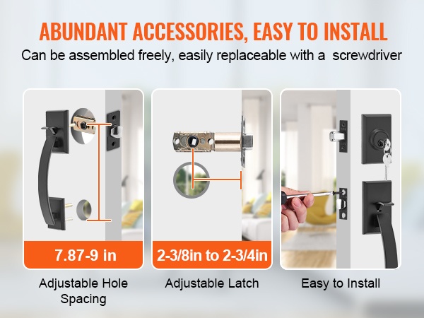 Kaksiosainen etuoven kahvasarja sisältää kaikki tarvittavat asennustarvikkeet sekä käyttöohjeen. Asennus onnistuu helposti ruuvimeisselillä ilman ammattilaisen apua. Sarja sopii oviin, joiden paksuus on 1-3/8 – 1-3/4 tuumaa.