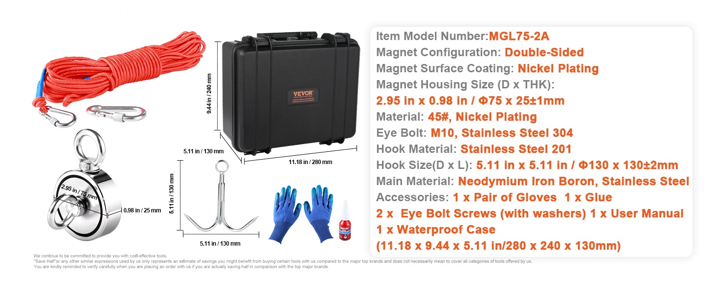 Settiin sisältyvät magneetti, köysi, haakutyyppinen koukku, hanskat, vedenpitävä säilytyslaatikko, kierrelukite ja silmukkapultti. Näin saat kaiken tarvittavan jokirantojen, satamien ja muiden vesistöjen rantojen tutkimiseen ja metalliesineiden nostamiseen vedestä.