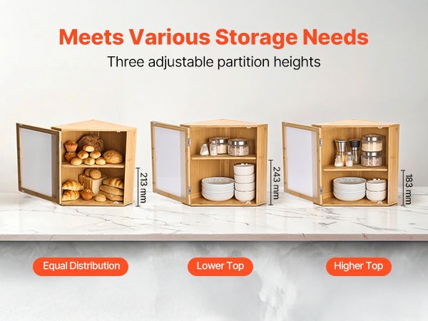 Bambulainen leipälaatikko tarjoaa runsaasti tilaa erilaisille leiville ja leivonnaisille. Sisätilan jakajat ovat säädettävissä, joten voit muokata tilan leipien ja muiden tuotteiden koon mukaan ja pitää keittiön järjestyksessä.