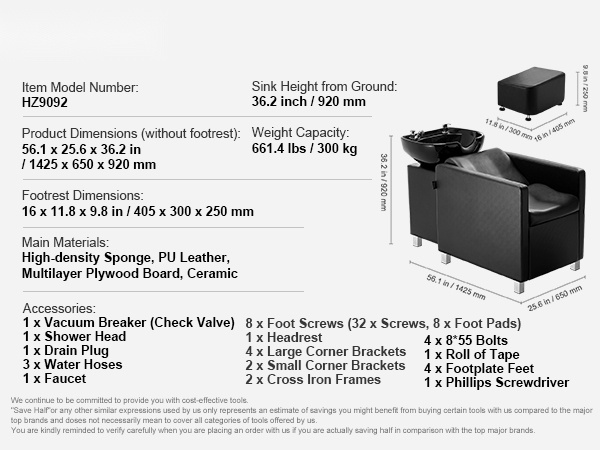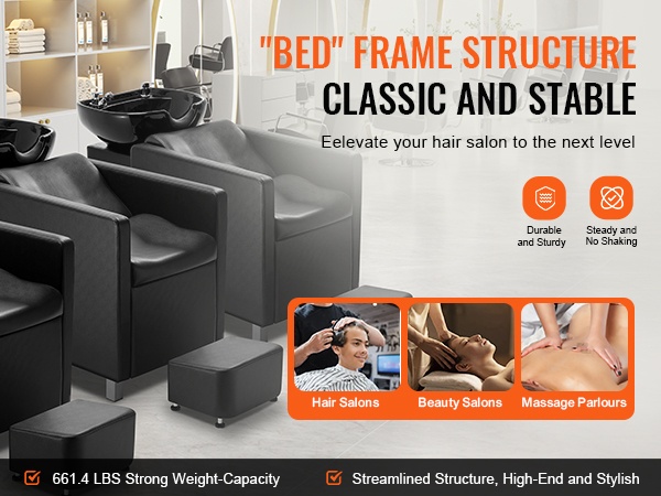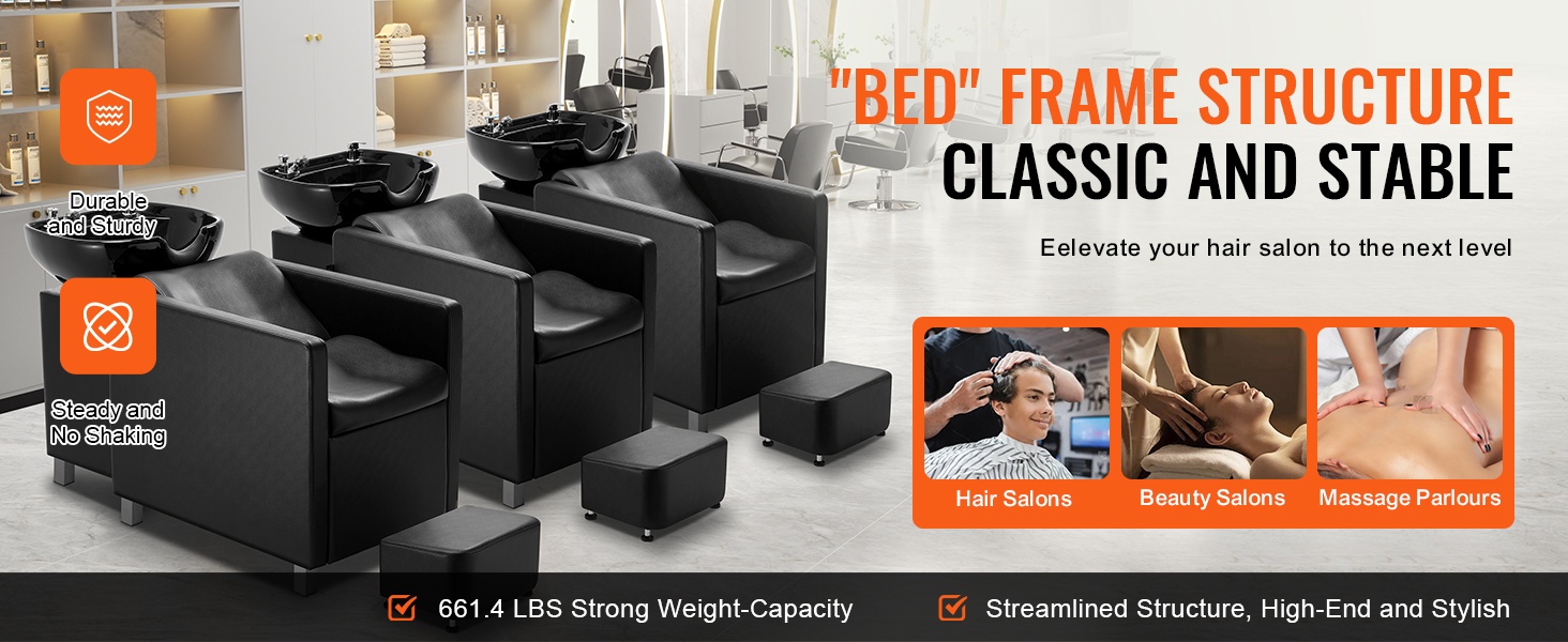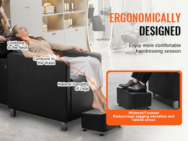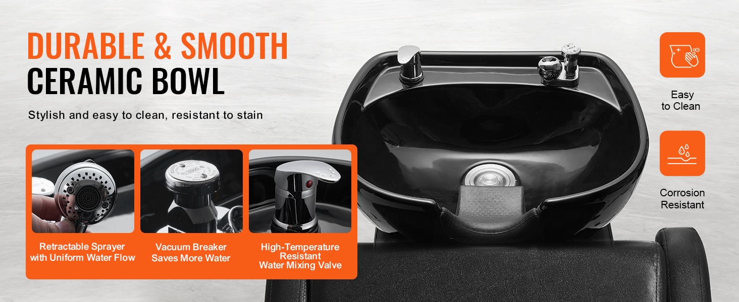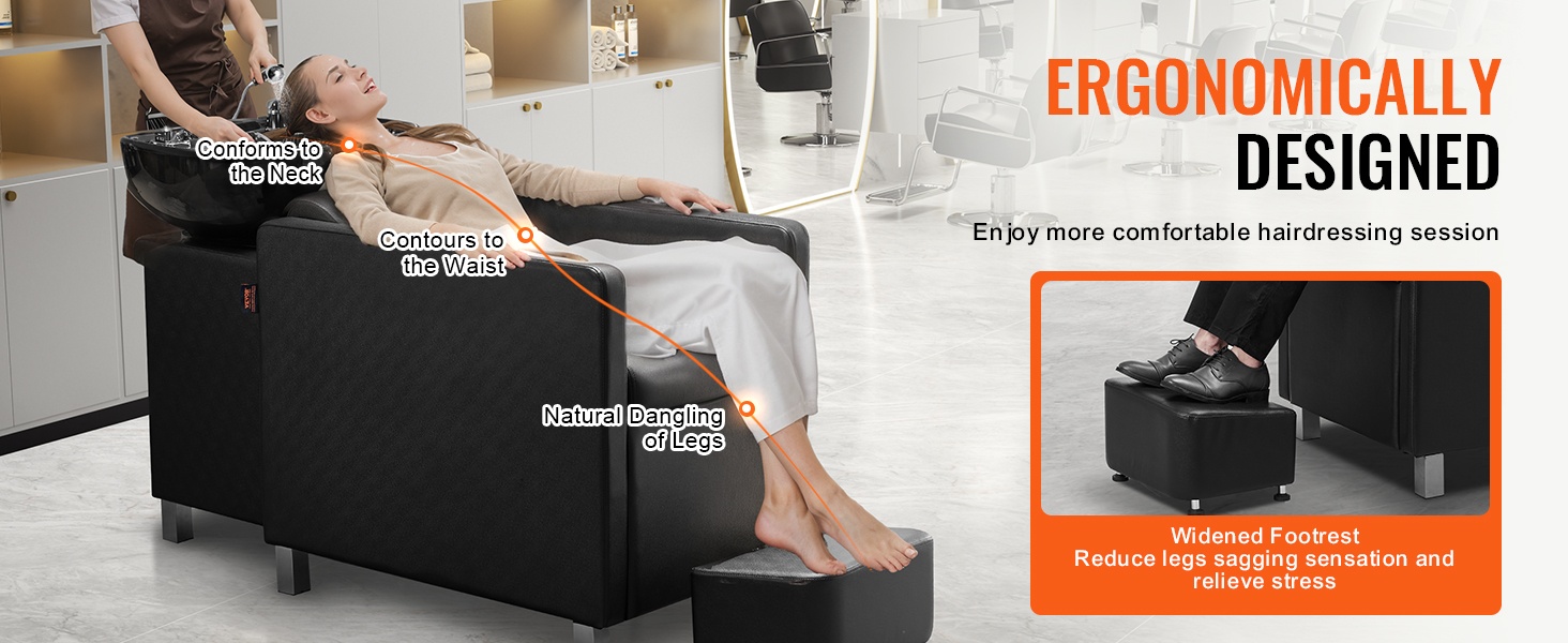 Tämä kampaamon pesutuoli tarjoaa miellyttävän hiustenpesukokemuksen sekä asiakkaalle että ammattilaiselle. Kokonaisuuteen kuuluu keraaminen pesuallas, tukeva runko jopa 661.4 lbs / 300 kg kantavuudella, leveä jalkatuki ja pehmeä PU-nahkainen istuin, jotka yhdessä lisäävät istuinmukavuutta ja vakautta.