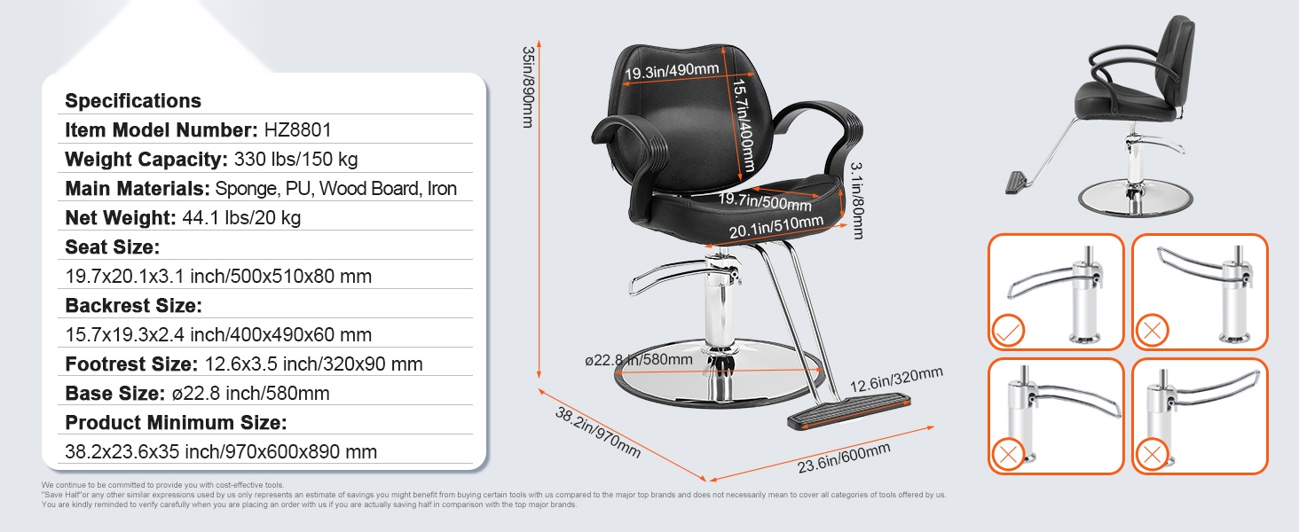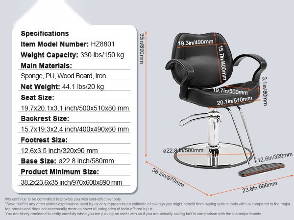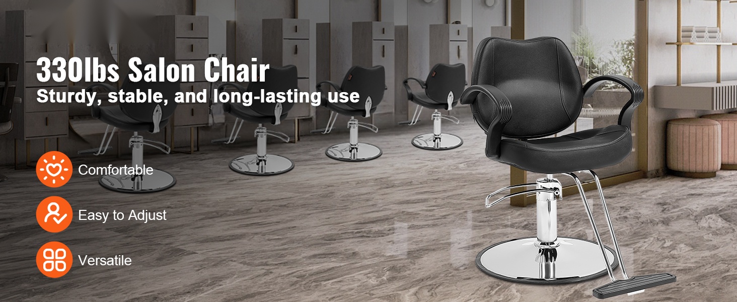Tämä kampaamotuoli on suunniteltu tarjoamaan vakaan ja mukavan istuma-asennon erilaisille asiakkaille. Valurautainen jalusta ja vahva hydraulipumppu takaavat hyvän kantavuuden, ja 330 lbs / 150 kg enimmäiskuorma sopii useimpiin käyttötarpeisiin parturi- ja kampaamotyössä.