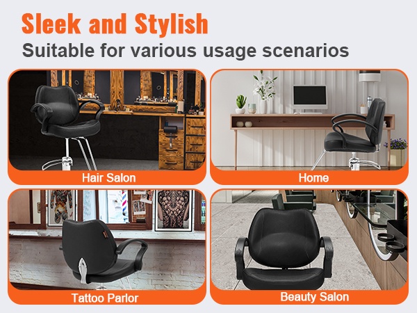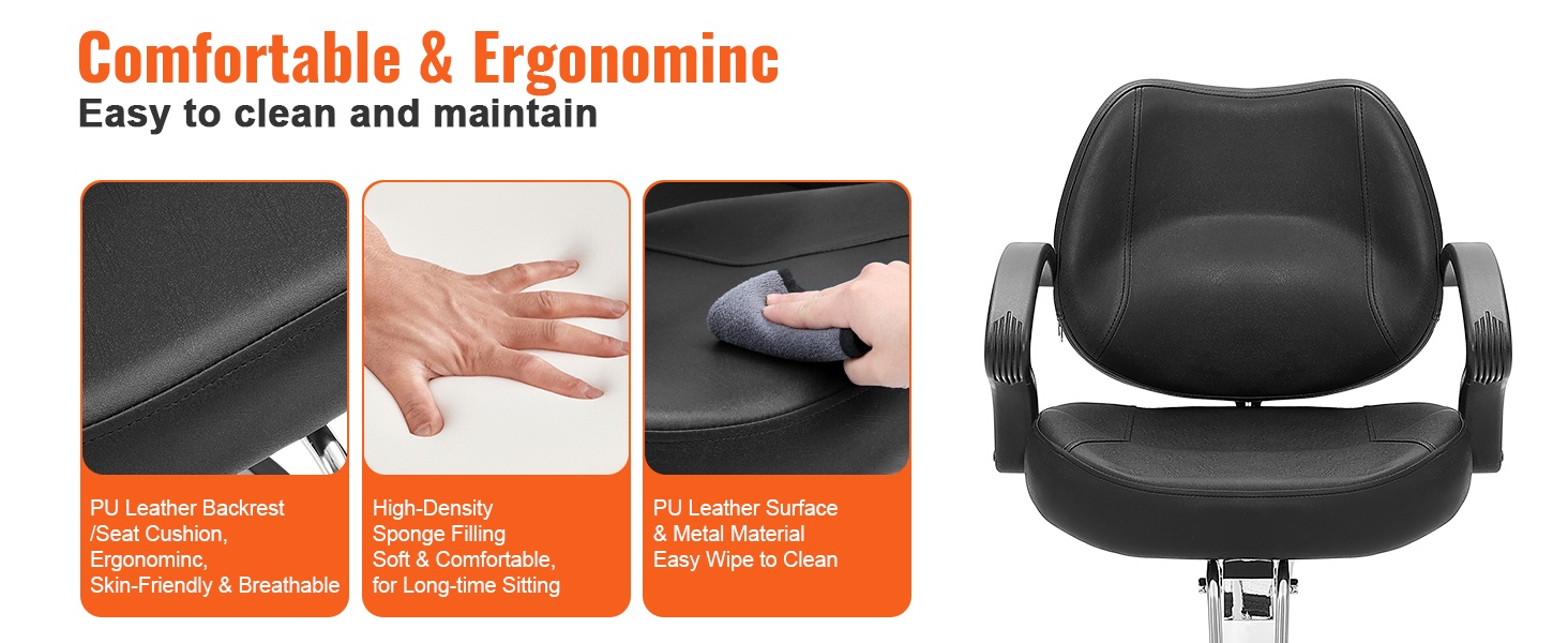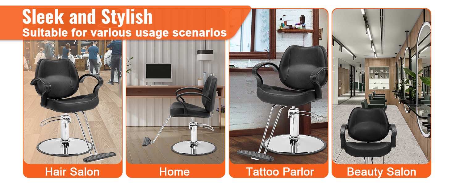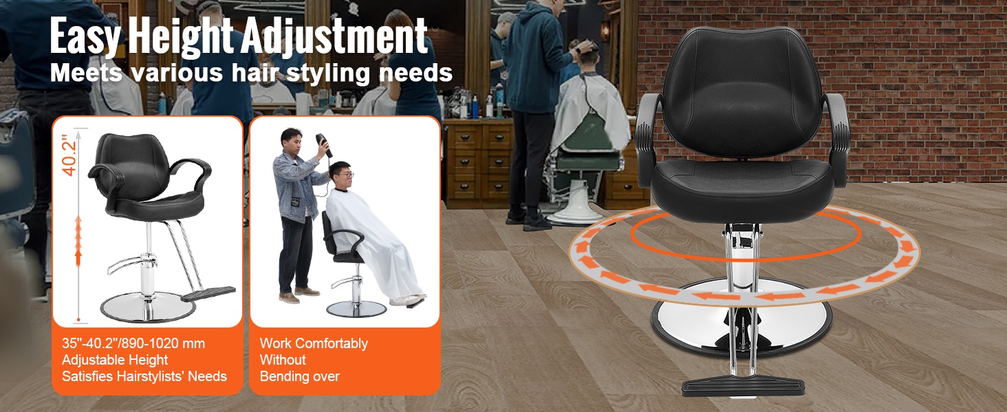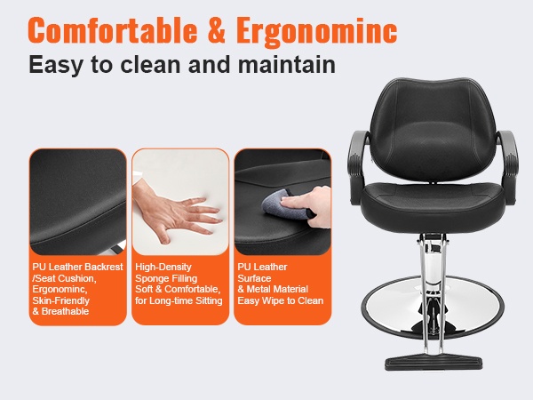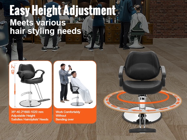 Tuolin korkeutta voi säätää portaattomasti, ja 360° kääntyvä rakenne helpottaa työskentelyä eri pituisten hiusstylistien tarpeisiin ilman jatkuvaa kumartelua. Hengittävästä PU-keinonahasta valmistetut istuin ja selkänoja, joissa on paksu korkeatiheyksinen vaahtomuovitäyte, tarjoavat miellyttävän istumismukavuuden ja ovat helppoja pyyhkiä puhtaaksi.