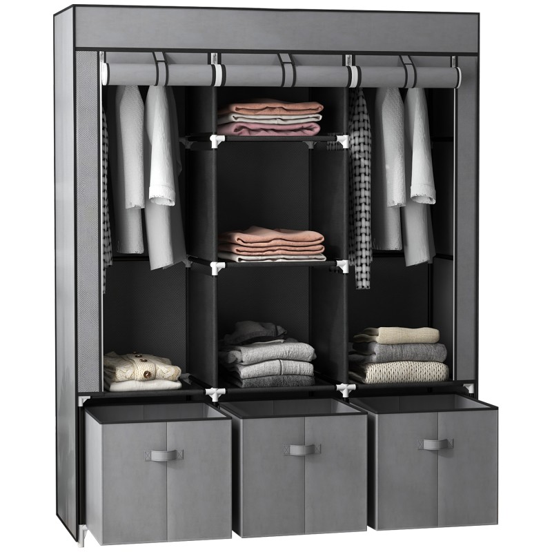 Tämä harmaa, kankaalla verhoiltu vaatekaappi on helppo tapa tuoda lisää säilytystilaa makuuhuoneeseen, olohuoneeseen tai vaatehuoneeseen. Kevyt, kokoon taitettava rakenne säästää lattiatilaa, mutta 5 avointa hyllyä, 3 suurta kangaslaatikkoa ja 2 ripustustankoa tarjoavat runsaasti tilaa vaatteille, laukuille ja liinavaatteille. Vlies-kangas suojaa sisällön pölyltä ja pitää kokonaisuuden siistin näköisenä.