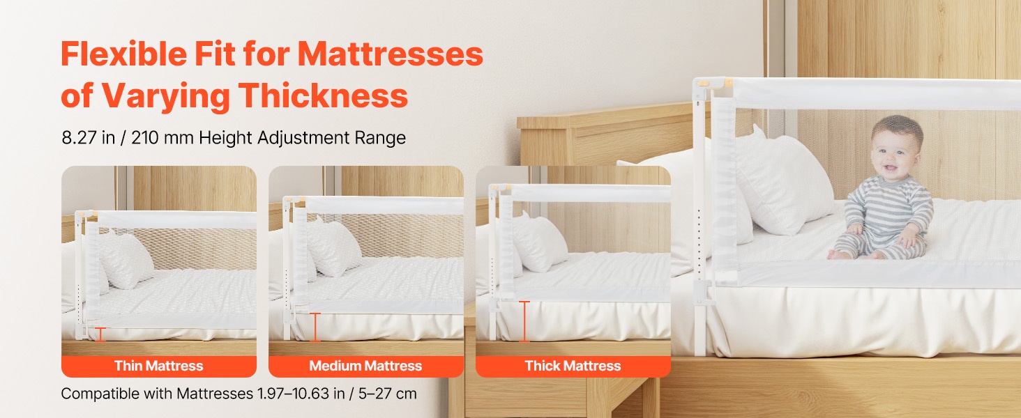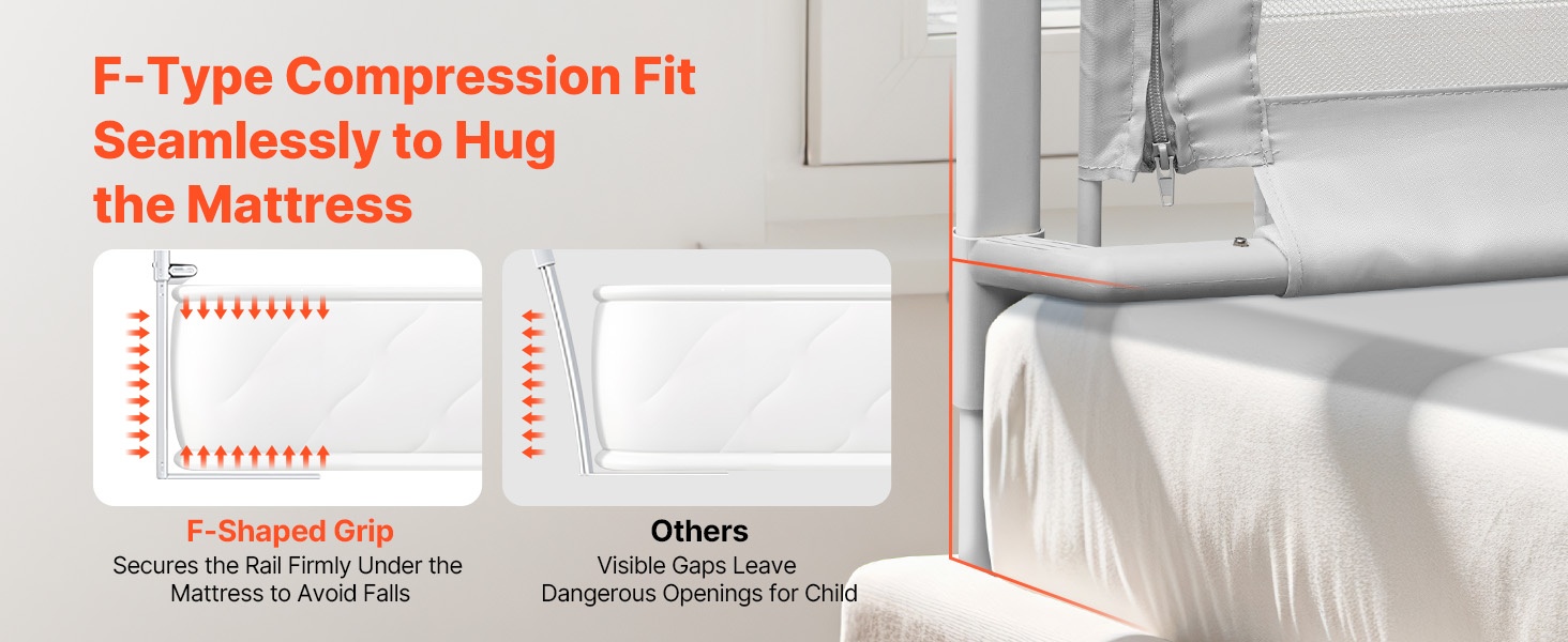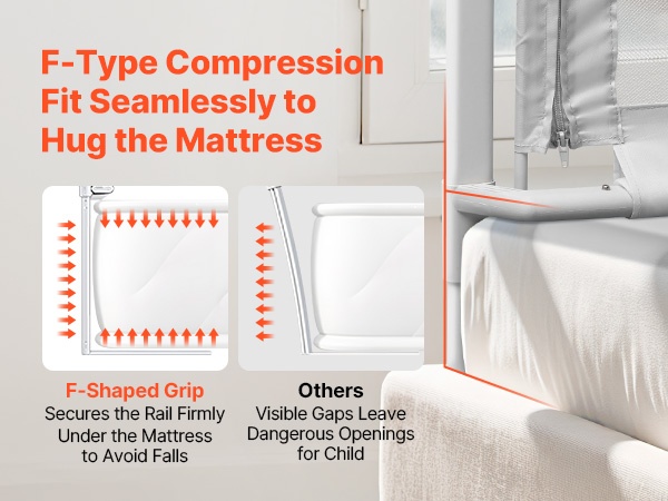 Erityinen F-muotoinen puristuskiinnitys asettuu patjan tasalle, mikä auttaa vähentämään pienten käsien tai jalkojen juuttumisen riskiä. Rakenne on suunniteltu antamaan tasainen, lähes saumaton reuna patjan ja laidan väliin.