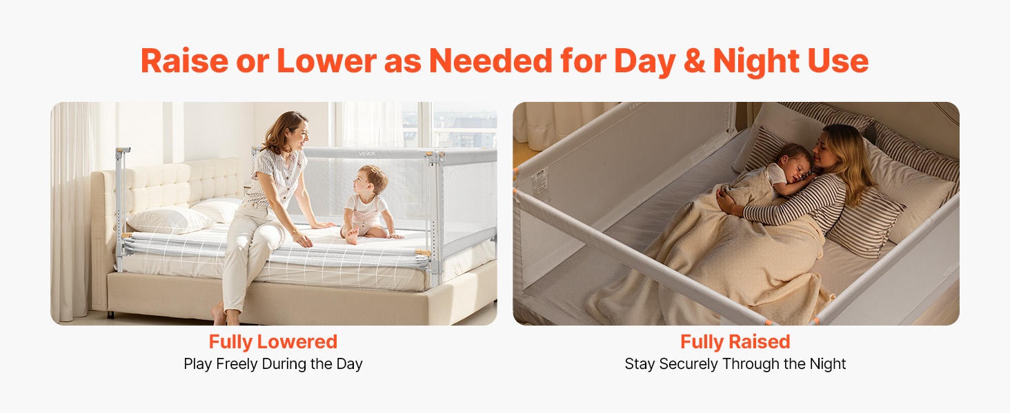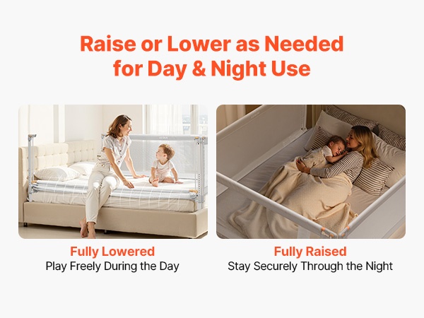 Laitaa voi nostaa ja laskea yhdellä kädellä. Päivällä sen voi laskea alas, jolloin pääsy sänkyyn ja sieltä pois sekä vierellä leikkiminen on vaivatonta. Yöllä laidan voi nostaa ylös lisäsuojan ja mielenrauhan takaamiseksi.