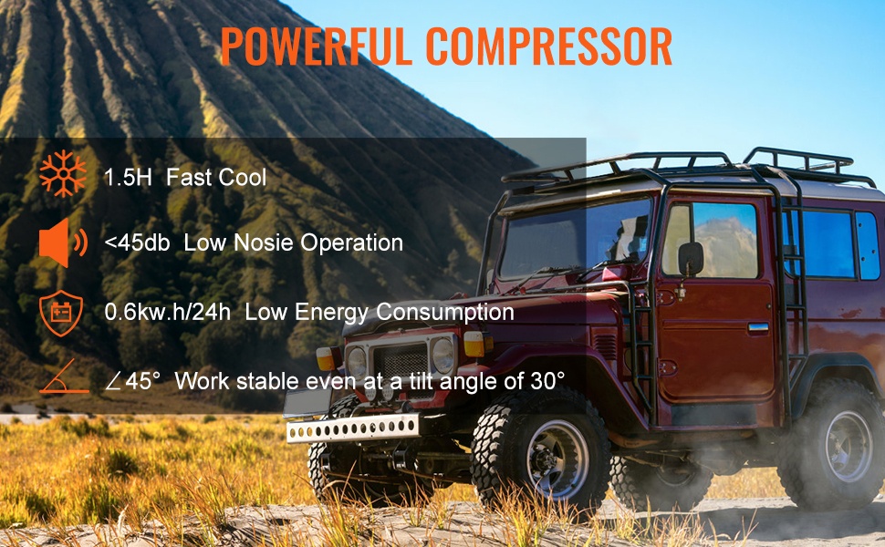 Käyntiääni on alle 45 dB, joten laite ei häiritse unta tai keskittymistä. Energiankulutus on vain 0.6kw.h/24h, ja laite toimii luotettavasti jopa 45 asteen kallistuksessa, mikä sopii hyvin matkailuautoihin ja veneisiin.