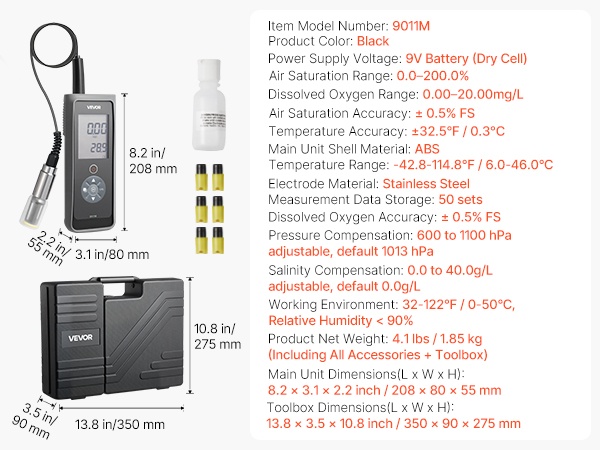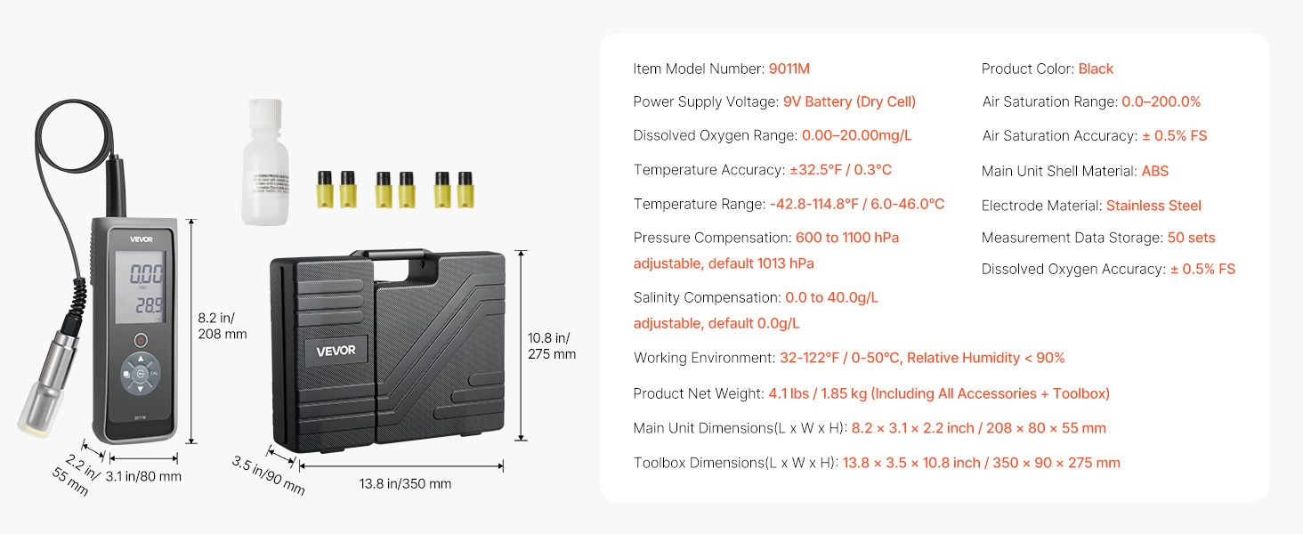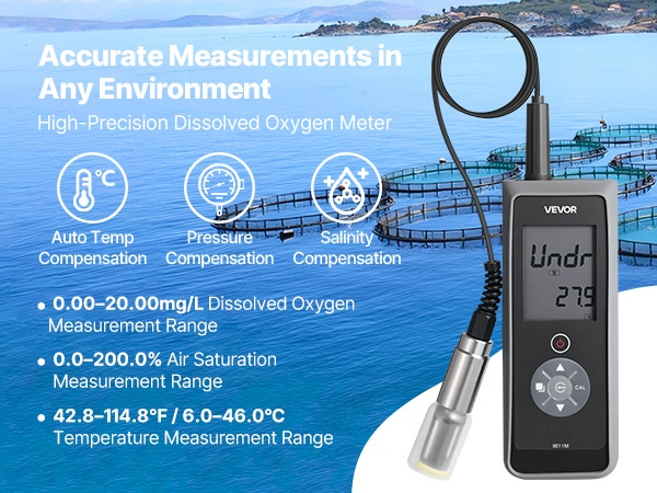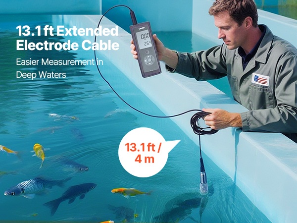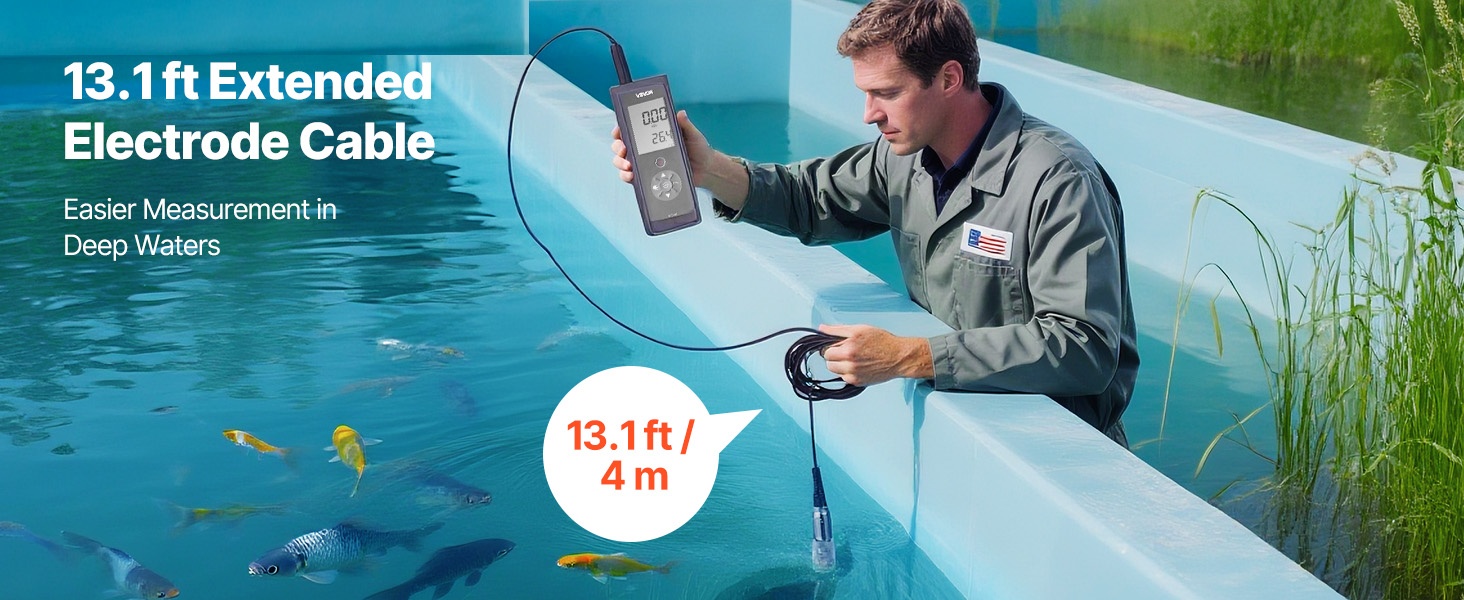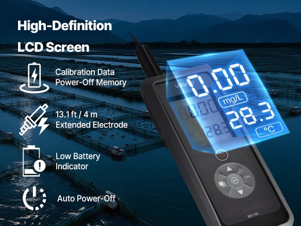 13.1 ft pituinen elektrodi yltää helposti syviin lampiin, kaivoihin tai suuriin vesisäiliöihin. Liuenneen hapen mittari helpottaa kenttätyötä ja mahdollistaa tarkkojen mittaustietojen keräämisen vaivattomasti.