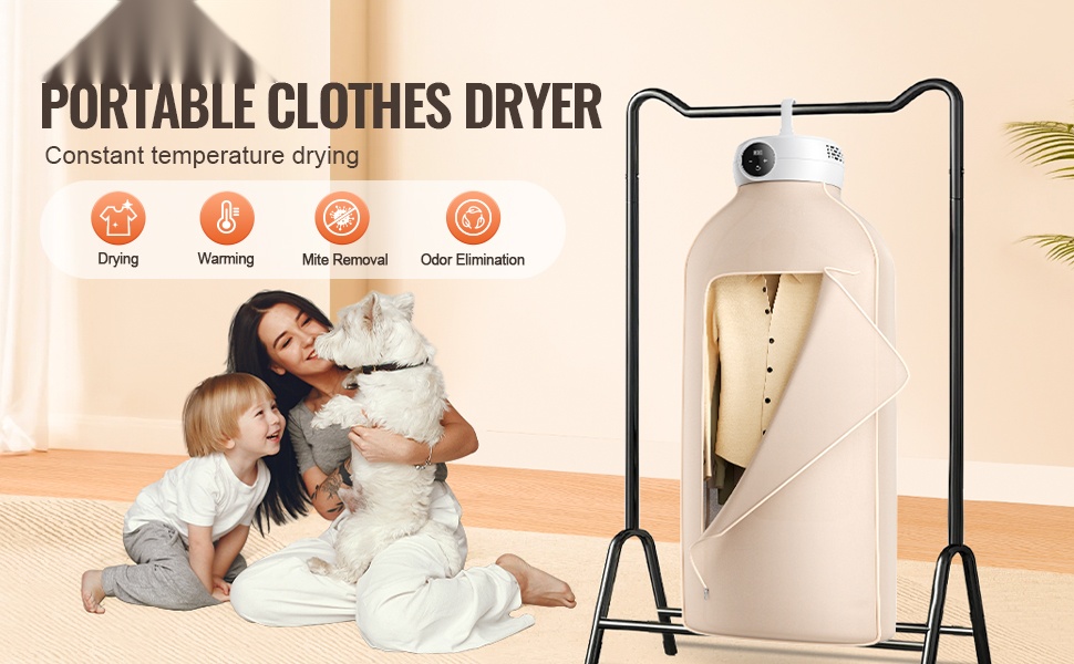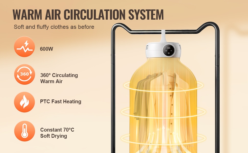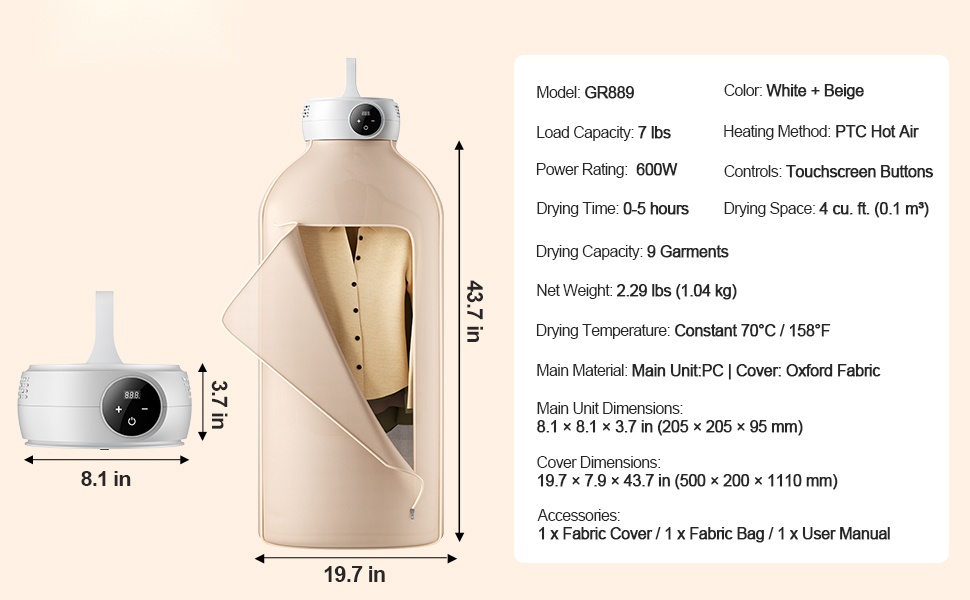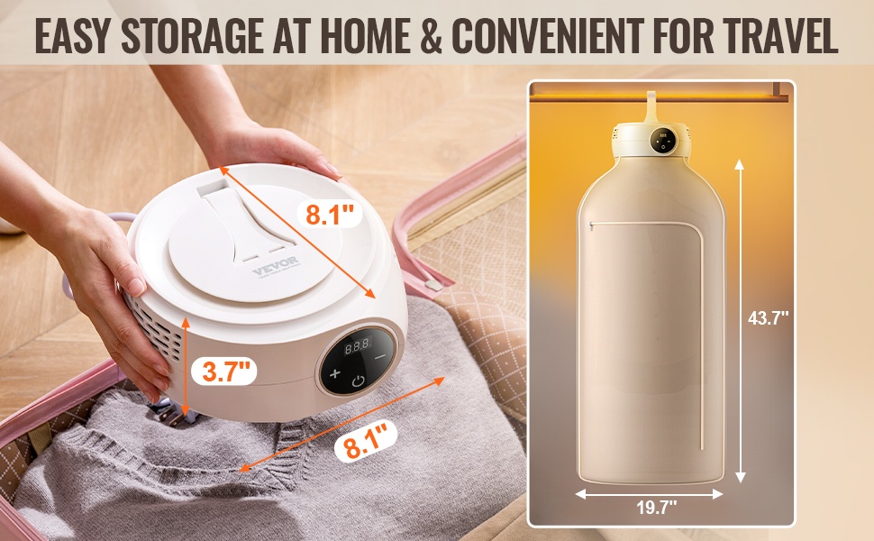 Tämä kompakti vaatekuivain, jonka mitat ovat 8.1 × 8.1 × 3.7 in (205 × 205 × 95 mm), sopii hyvin pieniin asuntoihin, opiskelija-asuntoloihin, matkailuautoihin ja hotelleihin. 360° lämpimän ilman kierto kuivaa vaatteet tasaisesti ja auttaa poistamaan kosteutta, pölypunkkeja ja hajuja.