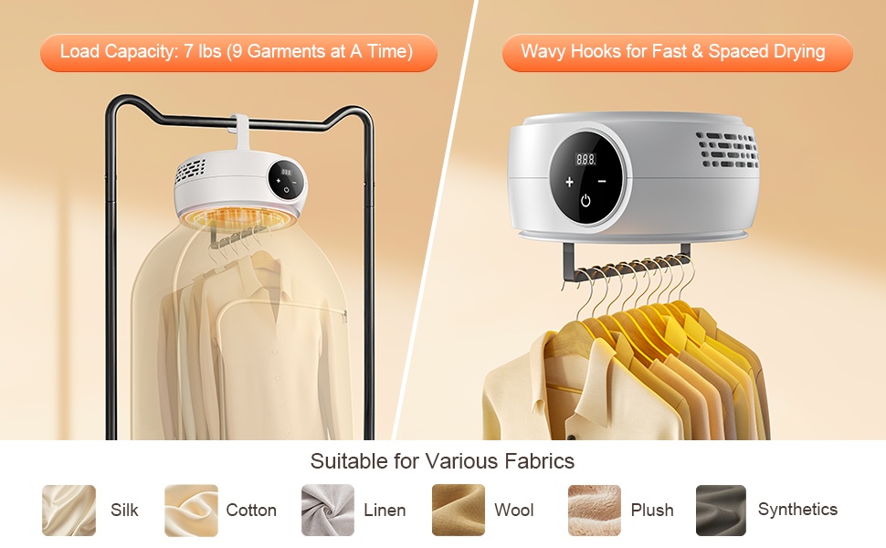 Kannettava vaatekuivain pystyy kuivamaan jopa 9 vaatetta, ja sen enimmäiskuormitus on 7 lbs. Aaltoilevat ripustuskoukut ja erillinen ripustusratkaisu estävät vaatteita liimautumasta toisiinsa, mikä tehostaa kuivumista myös sisältäpäin.