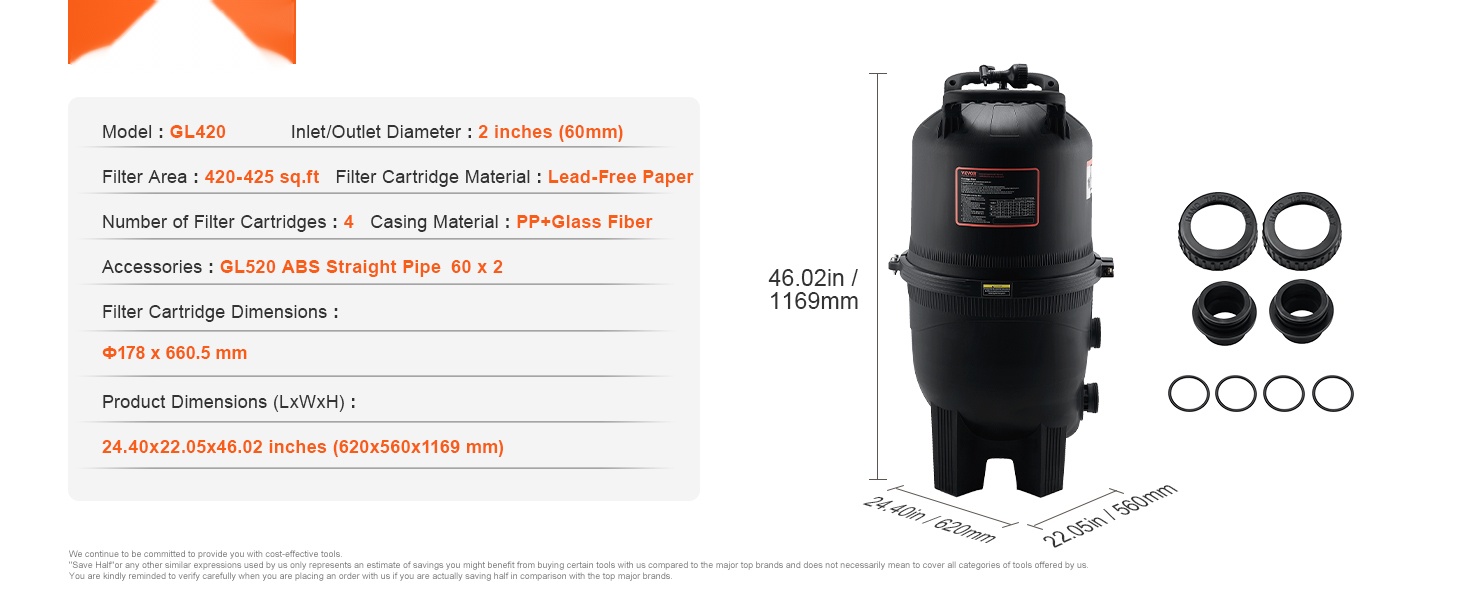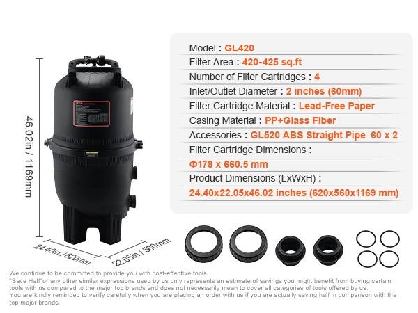 - Suodatusala: 49 Sq.m (520–525 sq.ft) – sopii keskikokoisiin ja suuriin altaisiin