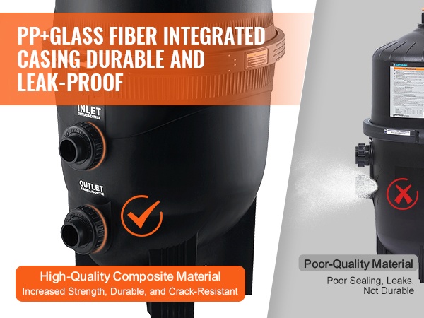 Suodattimen kotelo on valmistettu PP + lasikuitukomposiitista yksiosaisella valamistekniikalla. Rakenne on tukeva ja pitkäikäinen, ja auttaa estämään vuotoja. Saumaton muotoilu parantaa ulkonäköä ja pidentää suodattimen käyttöikää.