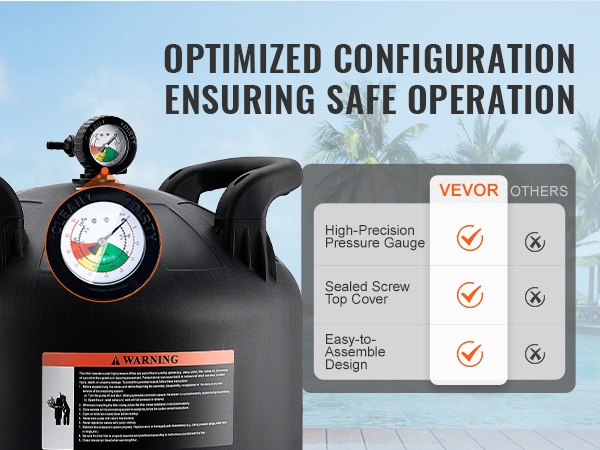 Suodattimessa on tarkka painemittari jatkuvaa paineen seurantaa varten. Yläosaan sijoitettu paineenpoistoventtiili vapauttaa ilman automaattisesti ja ehkäisee liian korkean vedenpaineen aiheuttamia vaurioita.