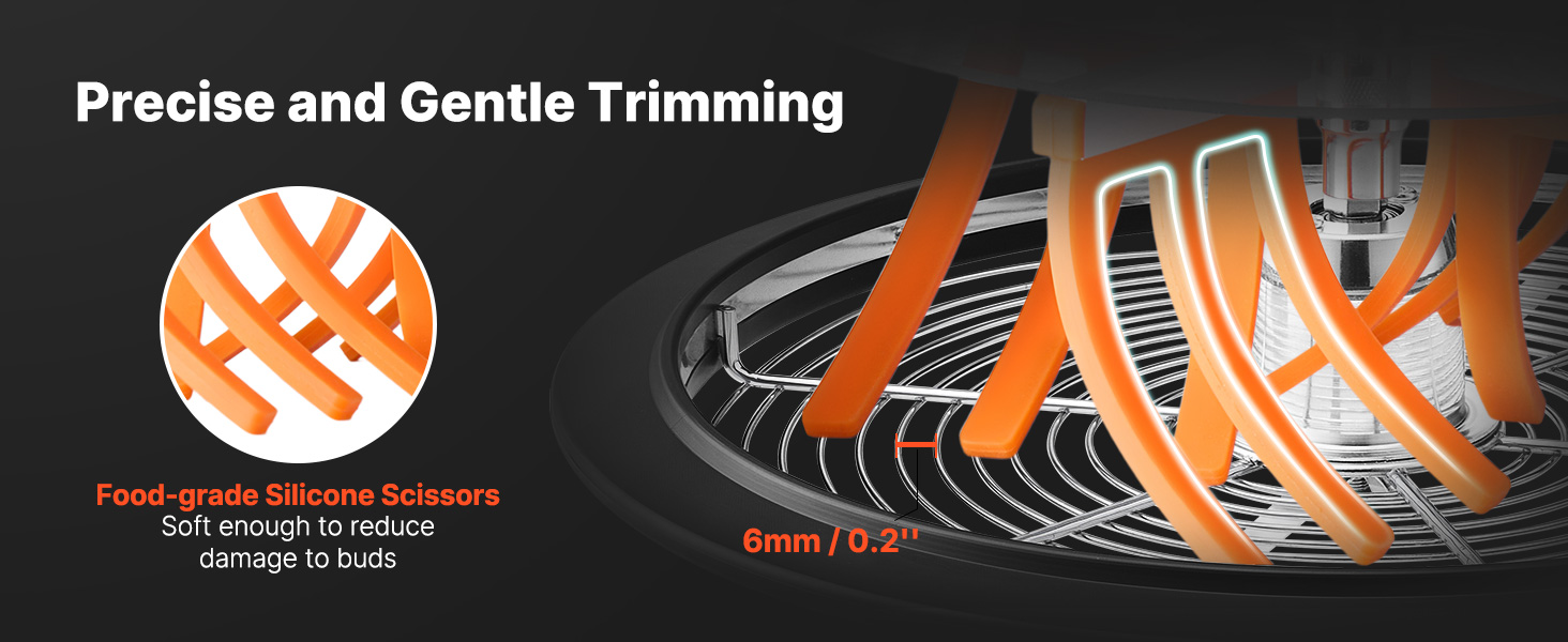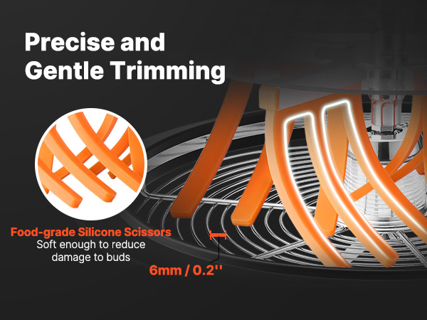 Kuivaan trimmaukseen suunnitellussa laitteessa käytetään elintarvikelaatuista silikonia, joka käsittelee nuppuja pehmeästi ja vähentää vaurioita. Tämä auttaa säilyttämään kasvien laadun, muodon ja rakenteen mahdollisimman hyvin.
