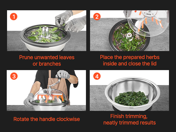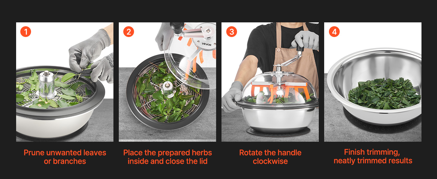 Käyttö on yksinkertaista: aseta yrtit tai kasvit kulhoon, sulje läpinäkyvä kansi ja pyöritä kahvaa myötäpäivään. Mekaaninen pyörimisliike ja terät huolehtivat tasaisesta leikkuusta pienellä vaivalla.
