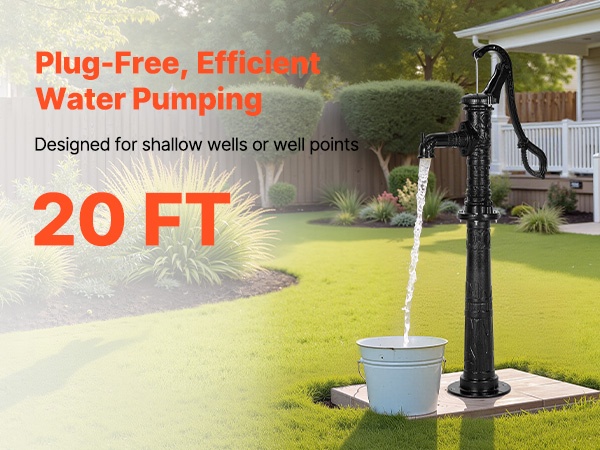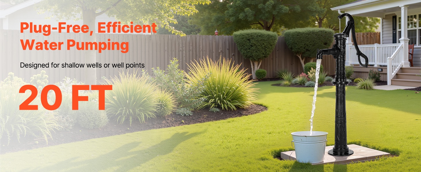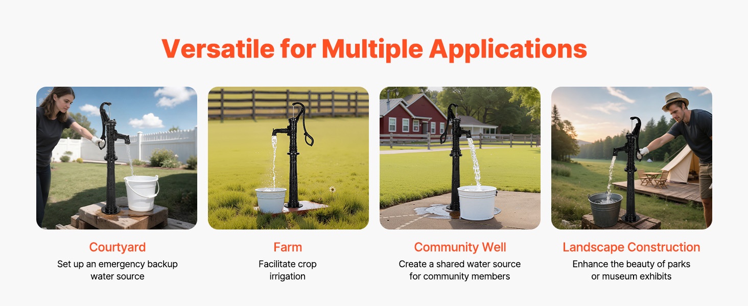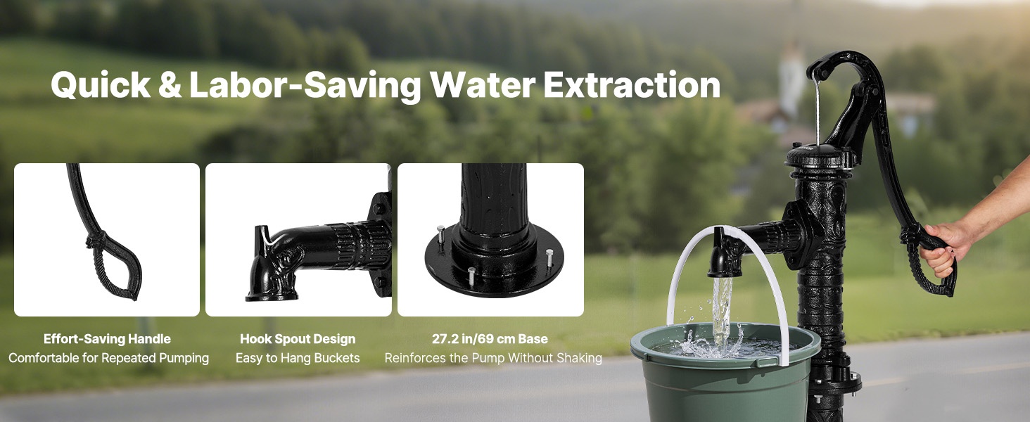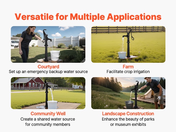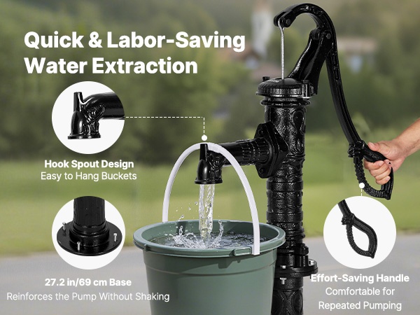 Pysy varautuneena sähkökatkosten tai juoksevan veden puutteen varalta. Tämä kaivon käsipumppu toimii luotettavana varavesilähteenä hätätilanteissa tai paikoissa, joissa ei ole vesijohtoa. Sähköä ei tarvita, vaan voit pumputa helposti raikasta vettä suoraan maasta.
