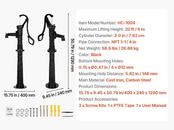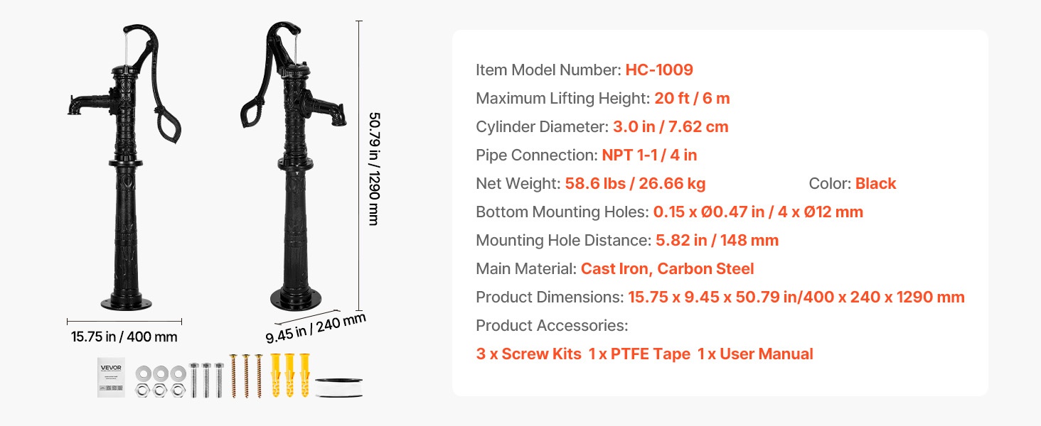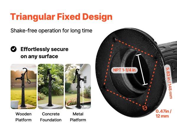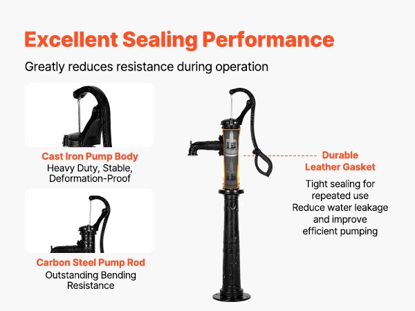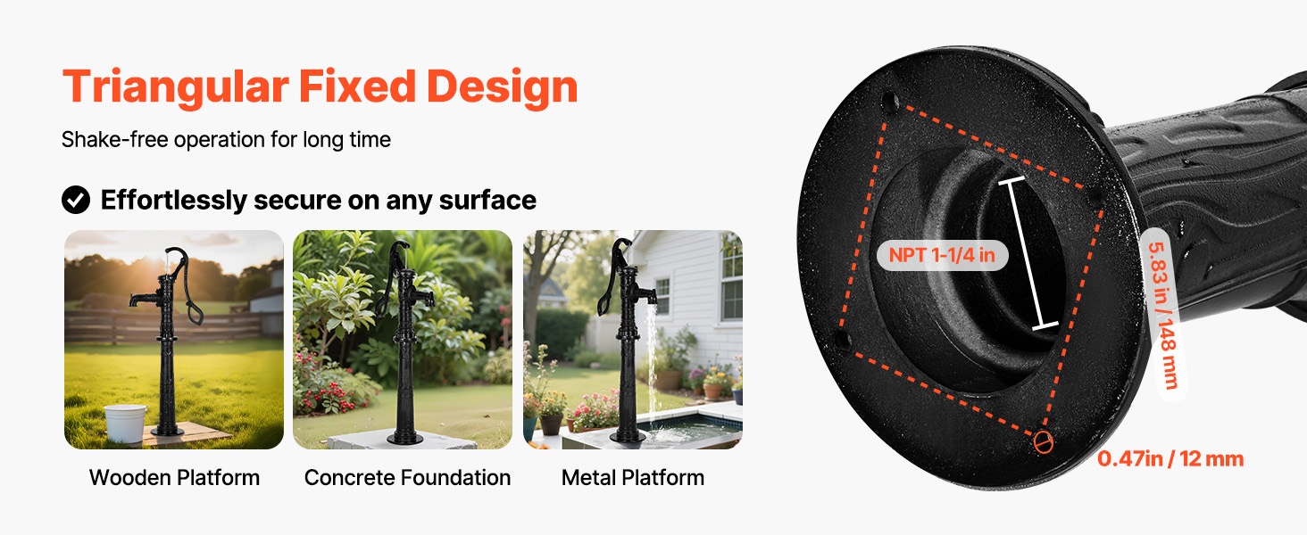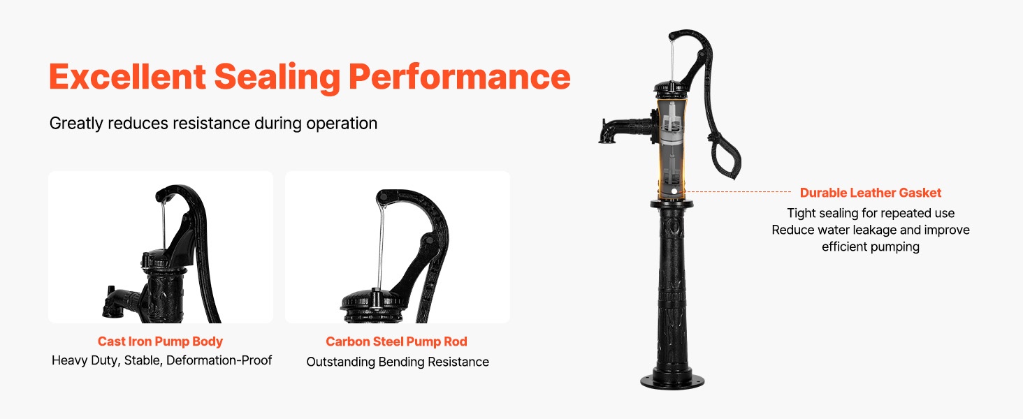 Pysy varautuneena sähkökatkosten tai juoksevan veden puutteen varalta. Tämä kaivon käsipumppu toimii luotettavana varavesilähteenä hätätilanteissa tai paikoissa, joissa ei ole vesijohtoa. Sähköä ei tarvita, vaan voit pumputa helposti raikasta vettä suoraan maasta.