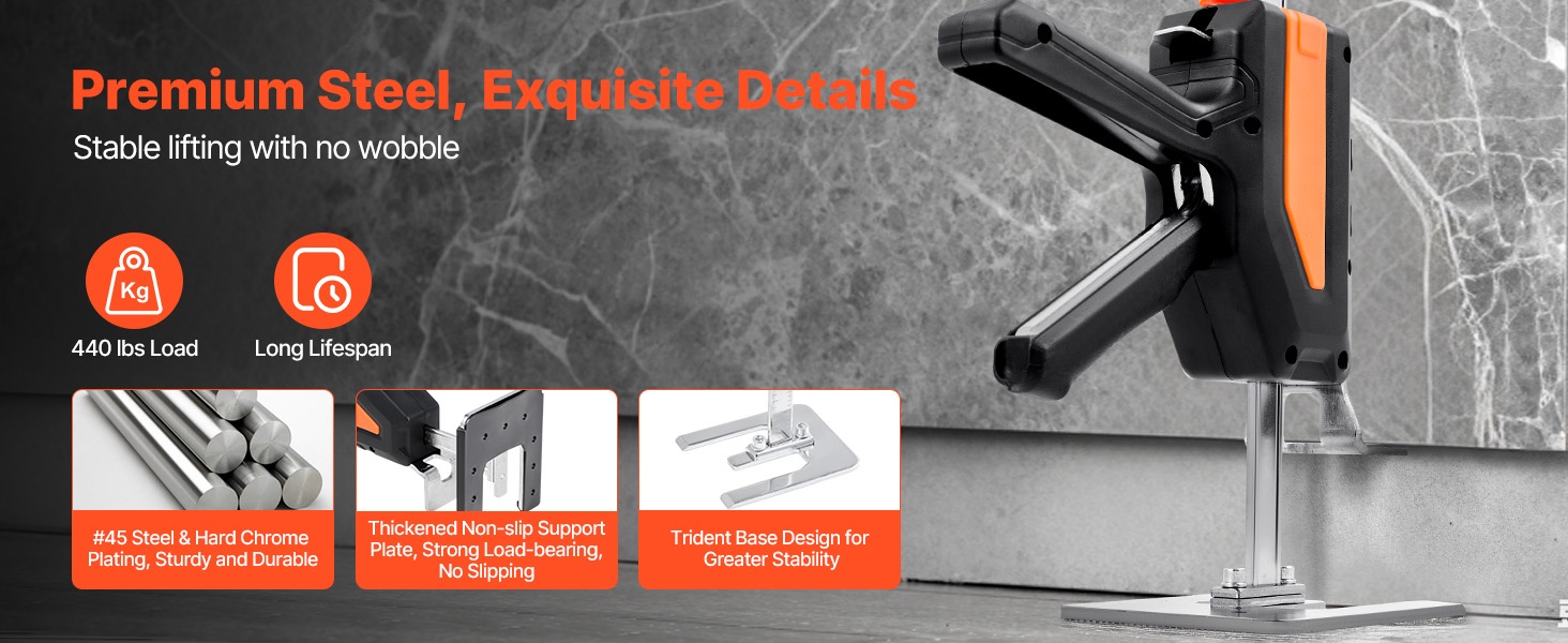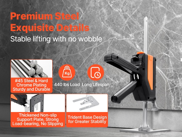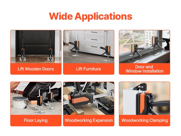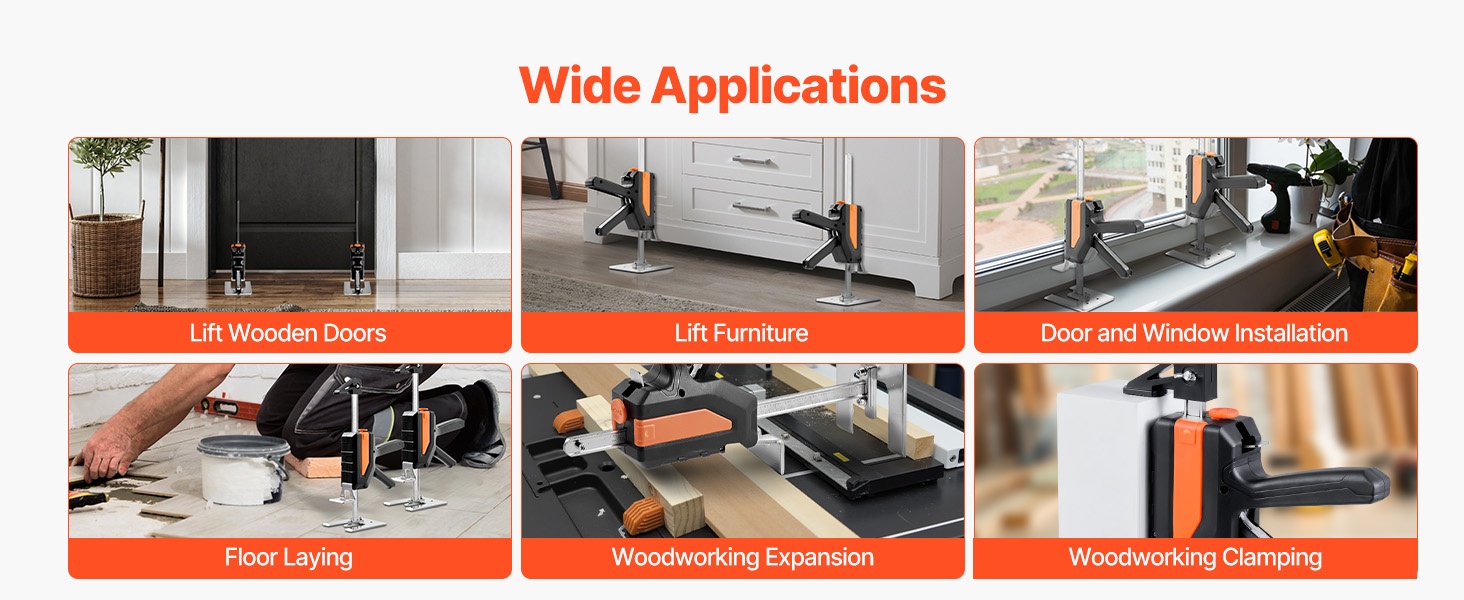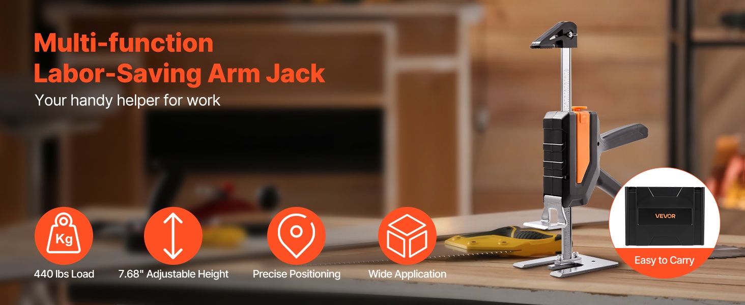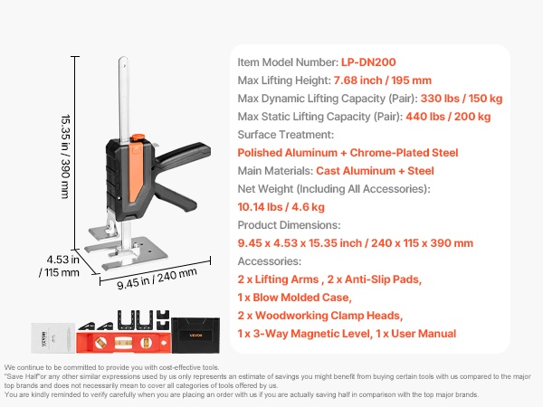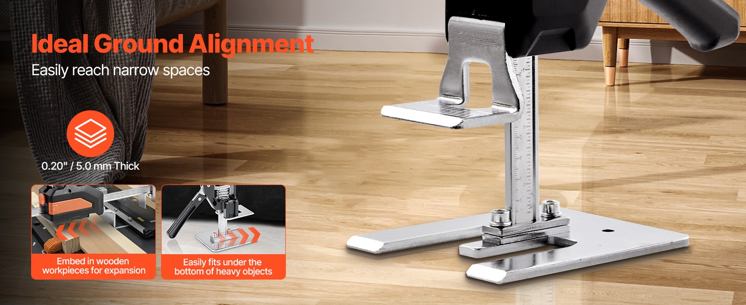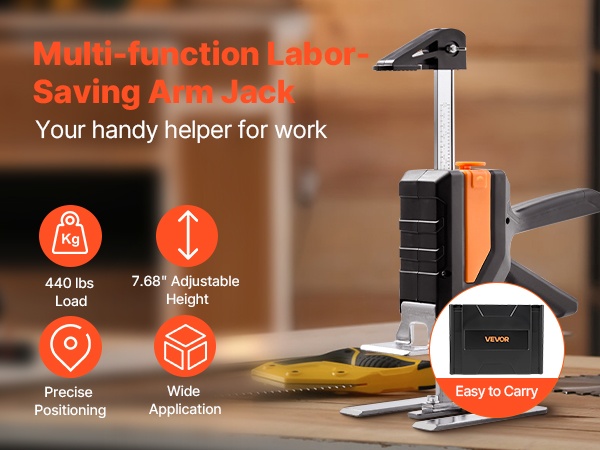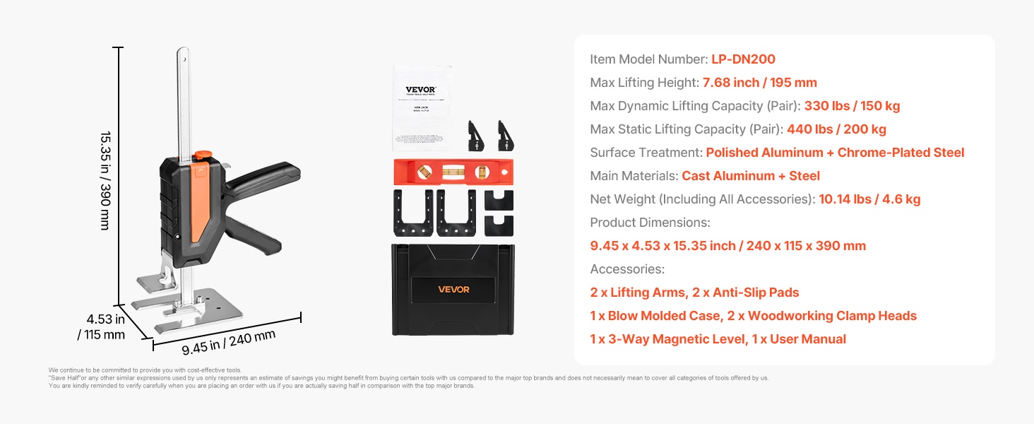 Käsikäyttöinen nostintyökalu helpottaa raskaiden esineiden nostamista ja siirtämistä. Säädettävä enimmäiskorkeus on 7.09 inch / 180 mm, joten se soveltuu esimerkiksi raskaiden kalusteiden ja laitteiden alle ulottumiseen siivousta tai säätöjä varten. Mukana tuleva kolmisuuntainen magneettinen vatupassi auttaa pitämään työkohteen suorassa ja tarttuu magneettinsa ansiosta metallipintoihin.