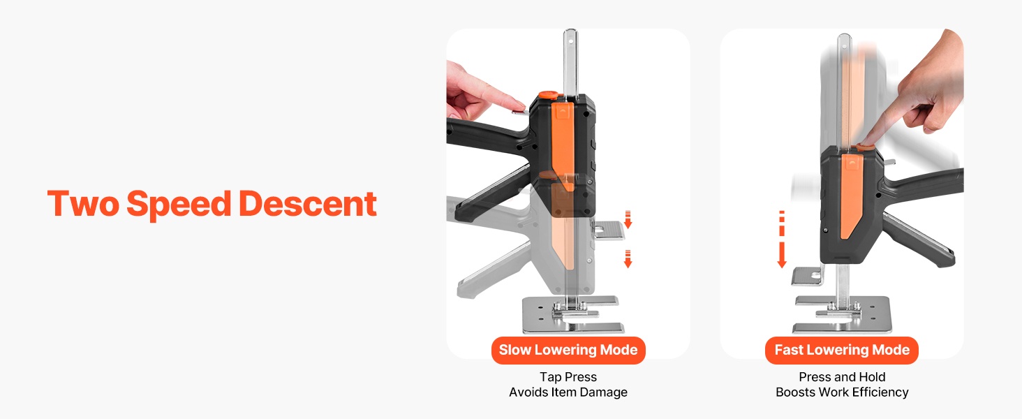 Nostimen käyttö on yksinkertaista: paina kahvaa nostaaksesi kuormaa nopeasti tai napauta alustalevyä laskeaksesi sitä hallitusti. Ergonominen kahva lisää käyttömukavuutta ja vähentää käsiväsymystä. Kevyen rakenteen ansiosta työkalu on helppo kuljettaa mukana työmaiden ja huoneiden välillä.
