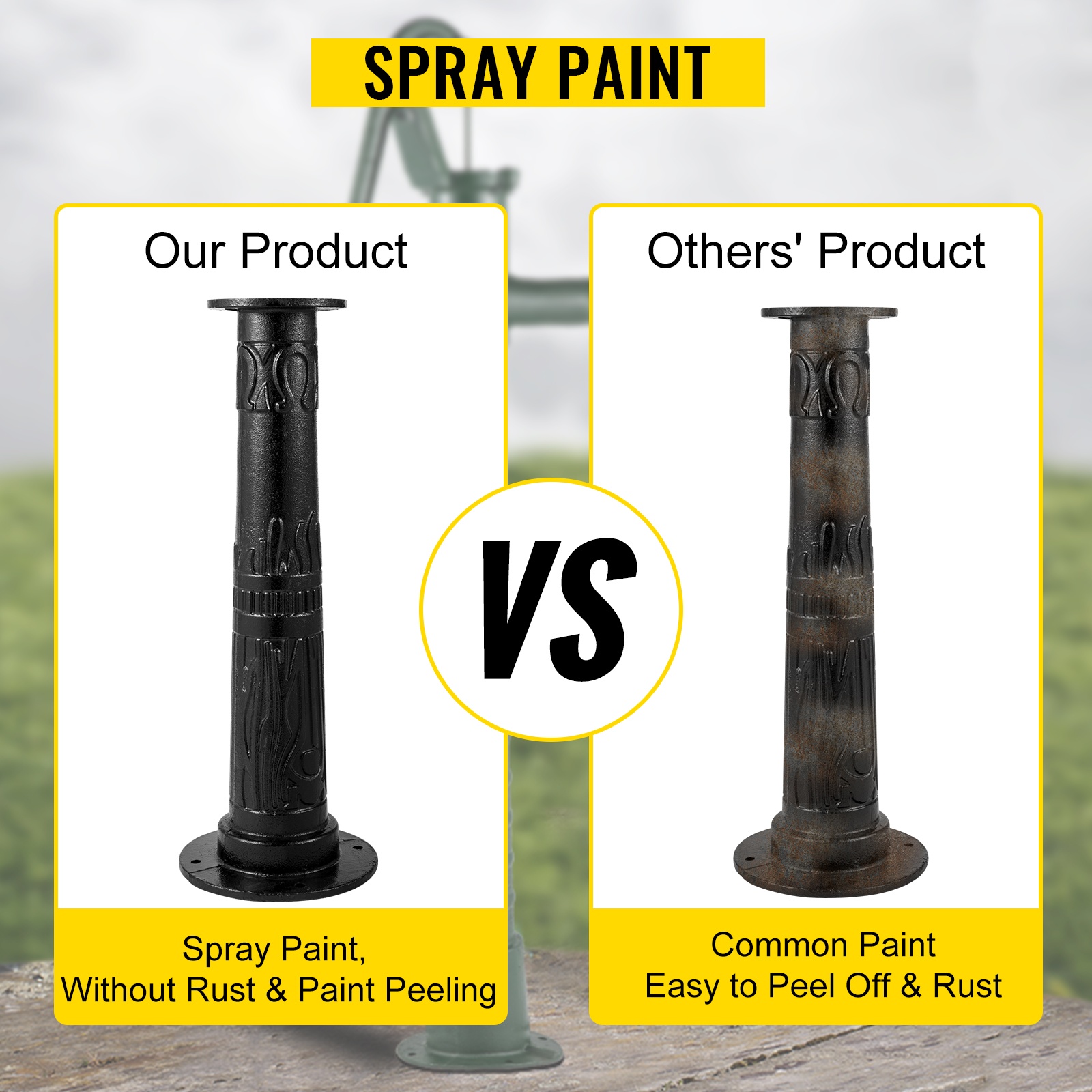Sekä käsipumppu että jalusta ovat valurautaa, ja putken seinämän paksuus on 8 mm. Tämä lisää kestävyyttä ja käyttöikää. Pinnan maalikerros suojaa korroosiolta ja ruosteelta.