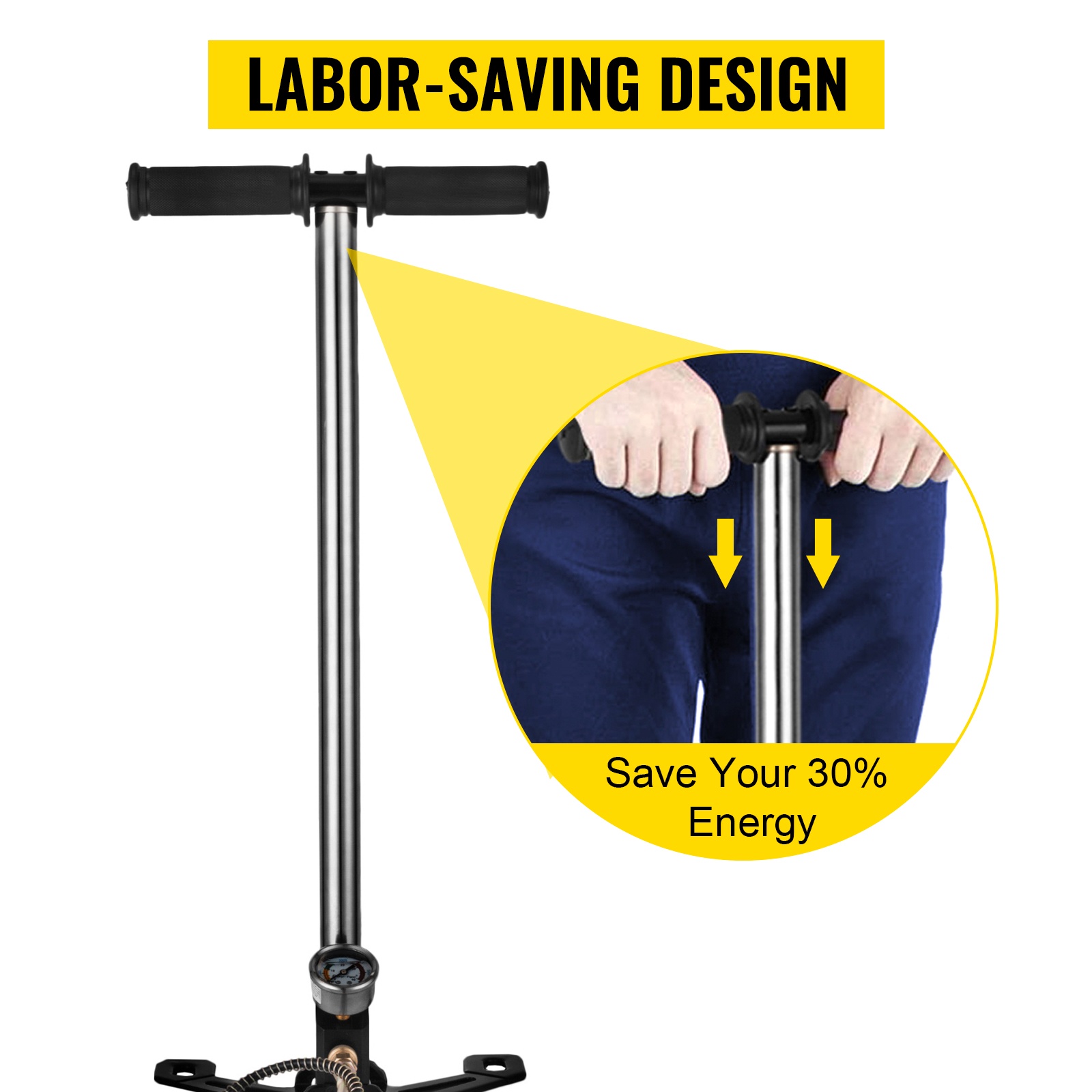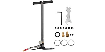 3-vaiheinen korkeapaineinen käsipumppu PCP-ilma-aseille ja paineastioille. Paksusta ruostumattomasta teräksestä valmistettu runko lisää käyttöikää ja pitää pumpun rakenteen jämäkkänä myös korkeissa paineissa jopa 4500 psi (0–30 MPa) asti. Taitettava jalkatuki helpottaa säilytystä ja kuljetusta.