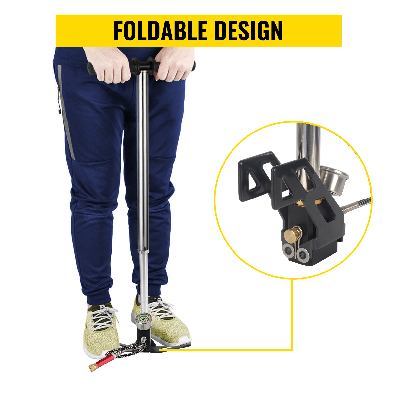 Leveä ja taitettava jalkatuki antaa tukevan alustan pumppaukselle ja voidaan kääntää kokoon säilytystä ja kuljetusta varten.