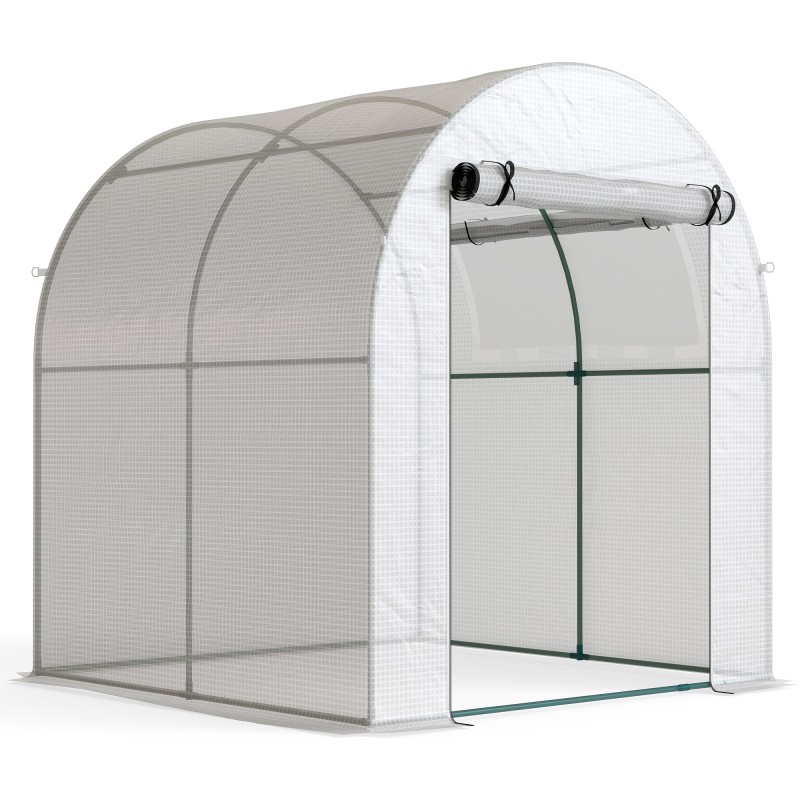 Valkoinen, kaksikerroksinen muovipeite läpäisee noin 85 % auringonvalosta, mutta tasaa samalla olosuhteita kasvien ympärillä. Rullattava ovi ja sivuikkuna tekevät kasvihuoneesta helppokäyttöisen ja auttavat pitämään ilman raikkaana. Jauhemaalattu teräsrunko, maahan kaivettavat reunat sekä mukana tulevat kiilat ja narut viimeistelevät tukevan rakenteen.