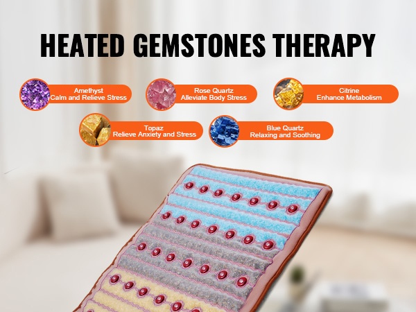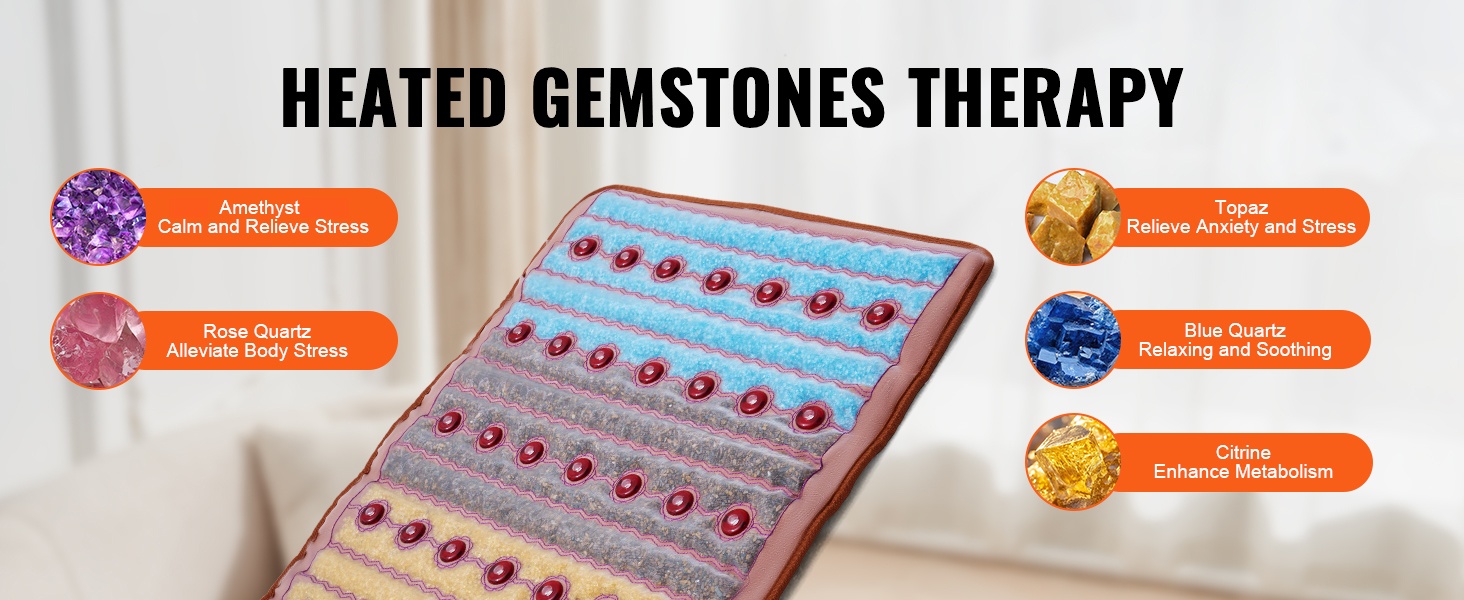 Lämpömatossa on 5 luonnollista jalokiveä: ametisti, ruusukvartsi, sitriini, topaasi ja sininen kvartsi. Lämpimät jalokivet tuottavat pehmeää lämpöä, joka voi helpottaa kehon jännitystä, rauhoittaa mieltä ja tukea verenkiertoa kokonaisvaltaisen rentoutumiskokemuksen aikaansaamiseksi.