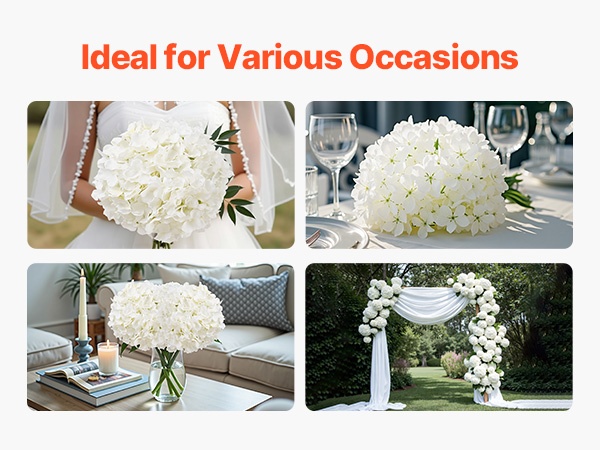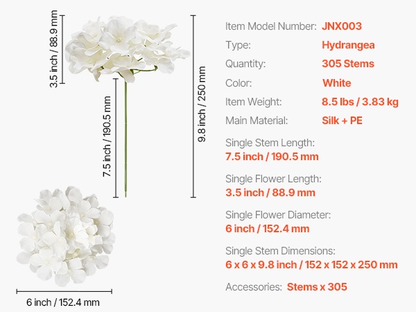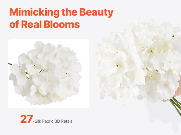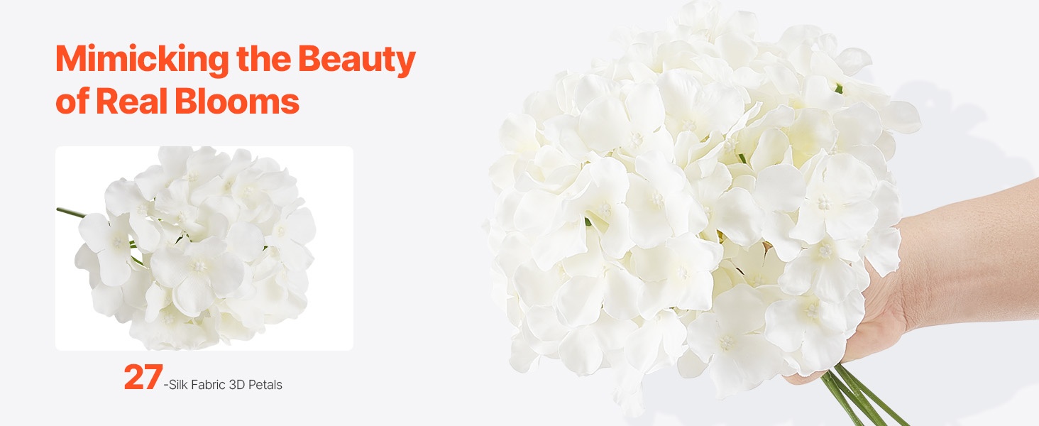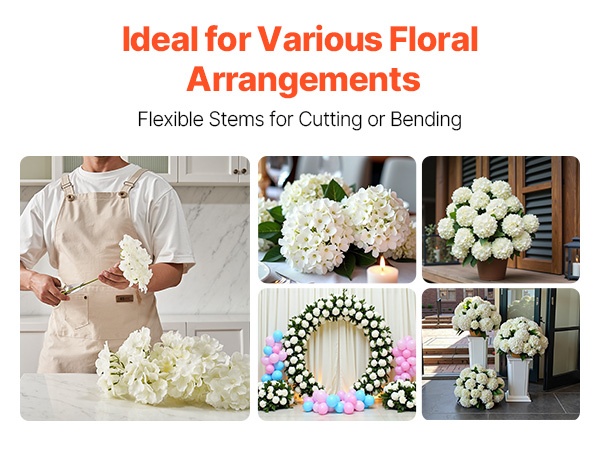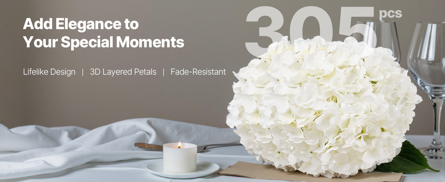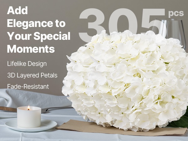 Setti sisältää 65 valkoista keinotekoista hortensiaa, jokaisessa 27 terälehteä luonnollisen kukinnon luomiseksi. Kukat ovat 9.8 tuumaa (korkeus) ja kukinnon halkaisija on 6 tuumaa, materiaali on haalistumista kestävää silkkiä. Joustavat varret on helppo taivuttaa ja lyhentää DIY-sommitelmia varten. Hoito on vaivatonta – riittää, että pyyhit pölyt. Sopii hyvin häihin, juhliin ja kodin sisustukseen.
