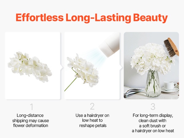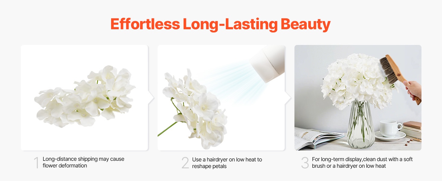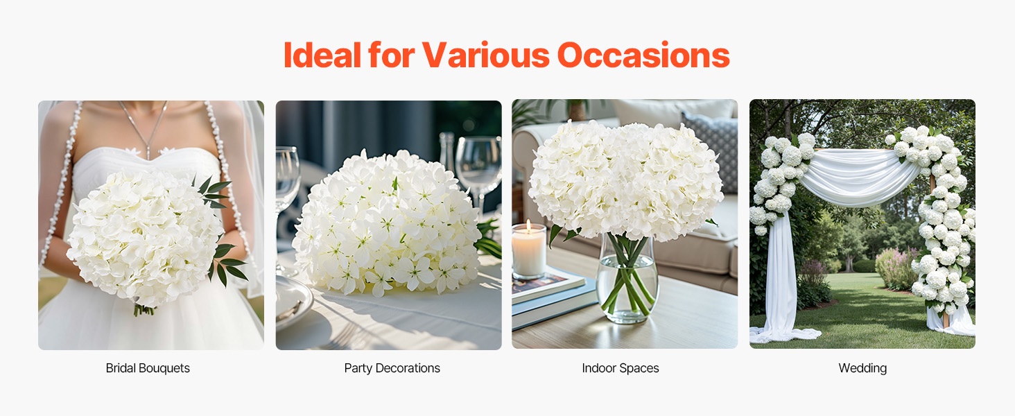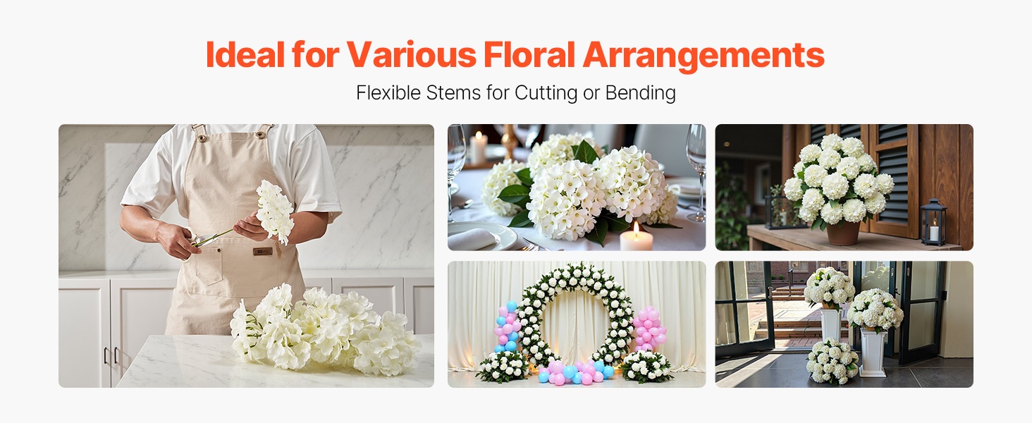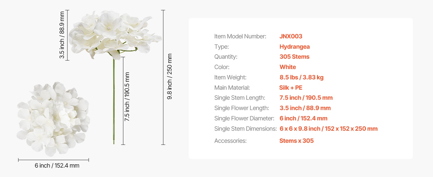 Setti sisältää 65 valkoista keinotekoista hortensiaa, jokaisessa 27 terälehteä luonnollisen kukinnon luomiseksi. Kukat ovat 9.8 tuumaa (korkeus) ja kukinnon halkaisija on 6 tuumaa, materiaali on haalistumista kestävää silkkiä. Joustavat varret on helppo taivuttaa ja lyhentää DIY-sommitelmia varten. Hoito on vaivatonta – riittää, että pyyhit pölyt. Sopii hyvin häihin, juhliin ja kodin sisustukseen.