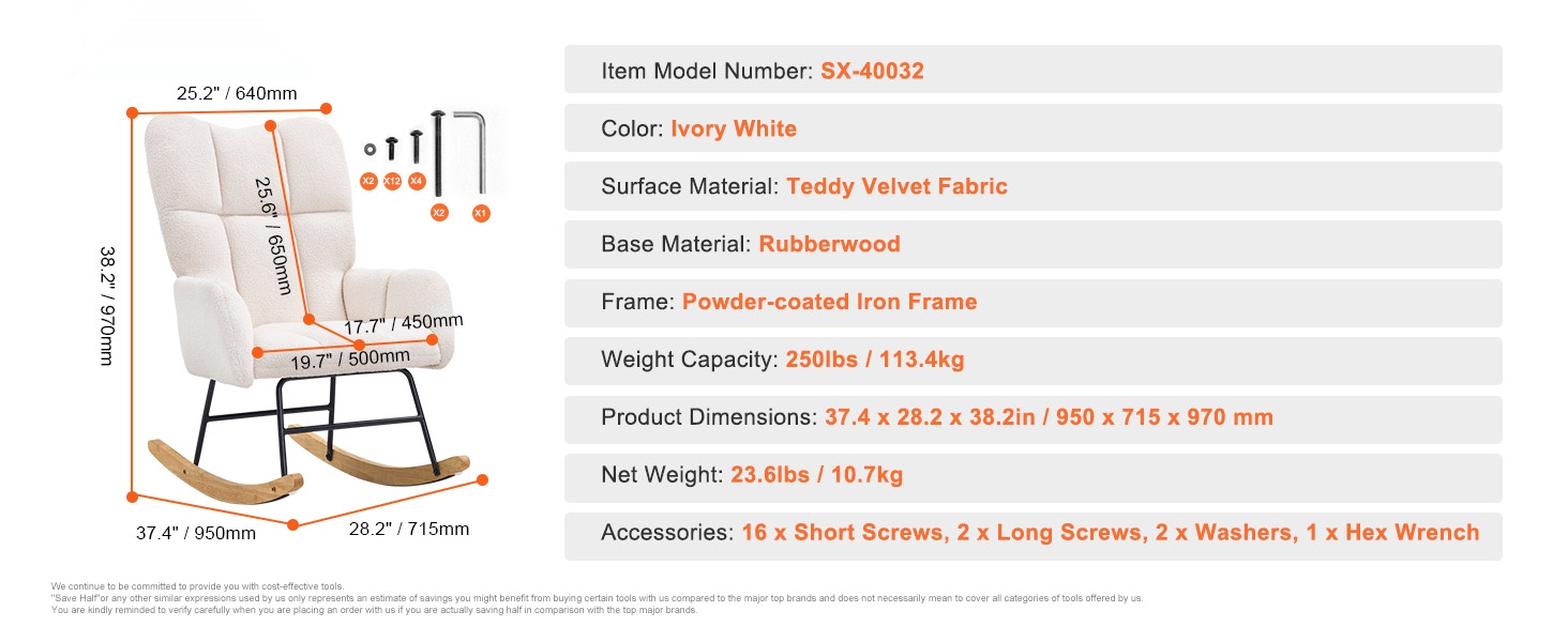 Keinutuoli teddy-kangas kumipuujalusta metallirunko 113,4 kg kantavuus korkeaselkäinen norsunluunvalkoinen imetystuoli