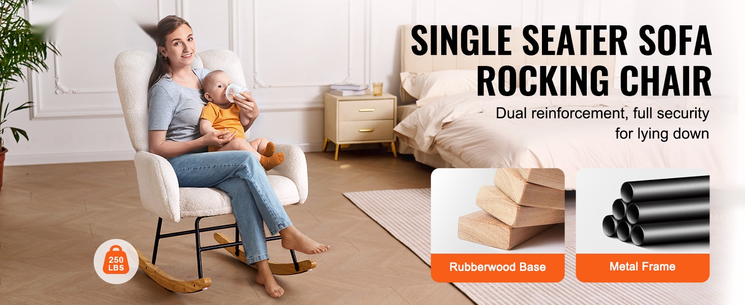 Yksipaikkainen keinutuoli tarjoaa rauhallisen ja miellyttävän istumapaikan lastenhuoneeseen, makuuhuoneeseen tai olohuoneeseen. Pehmeä teddy-pintakangas, korkea selkänoja ja paksu istuinpehmuste tekevät tuolista mukavan sekä arjen lepohetkiin että vauvan hoitoon.