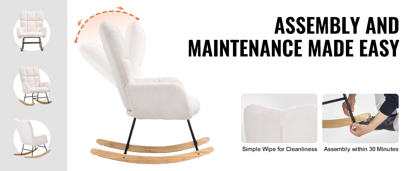 Selkeiden kokoamisohjeiden avulla keinutuolin saa koottua noin 30 minuutissa. Hoito on vaivatonta: pinnat voi puhdistaa pyyhkimällä ne pehmeällä kuivalla liinalla.