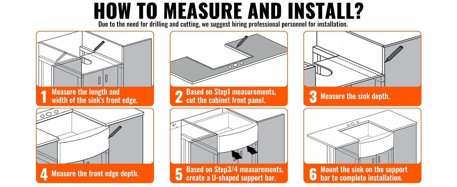 Mittaamis- ja asennusvaiheet on jaettu selkeisiin osiin, joita voi seurata kuvitettujen ohjeiden avulla. Näin altaan upotus ja kiinnitys onnistuvat sujuvasti, kun mitat ja työtaso ovat ohjeiden mukaiset.