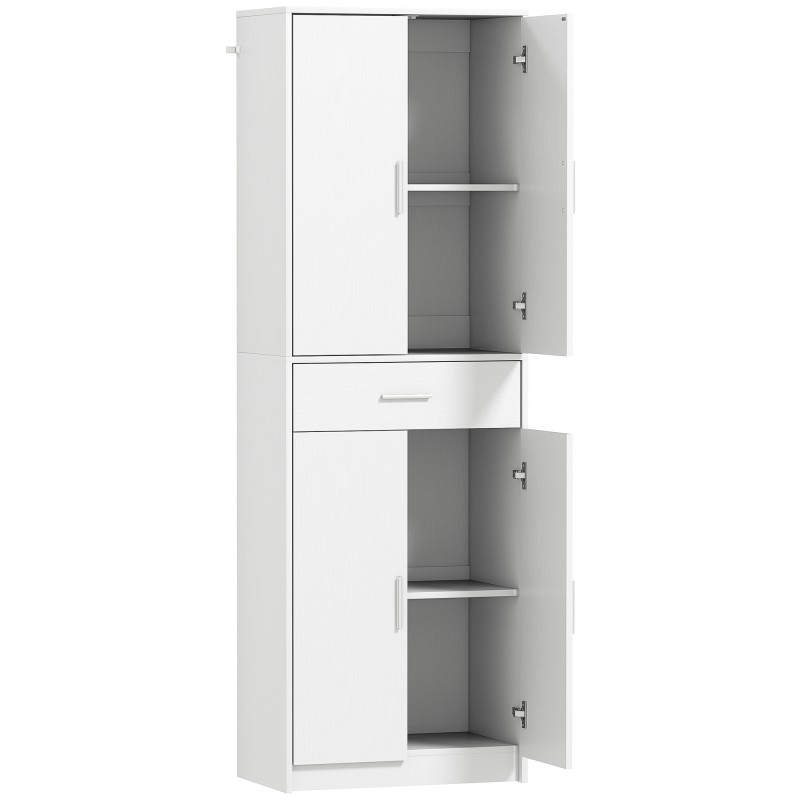 Tämä valkoinen korkea kaappi tuo lisää säilytystilaa keittiöön, ruokailutilaan, olohuoneeseen tai työhuoneeseen. Yläkaappi, keskellä sijaitseva laatikko ja alakaappi pitävät tavarat siististi piilossa ja suojassa pölyltä, kun taas pelkistetty muotoilu ja hopeansävyiset vetimet sopivat monenlaiseen sisustukseen.